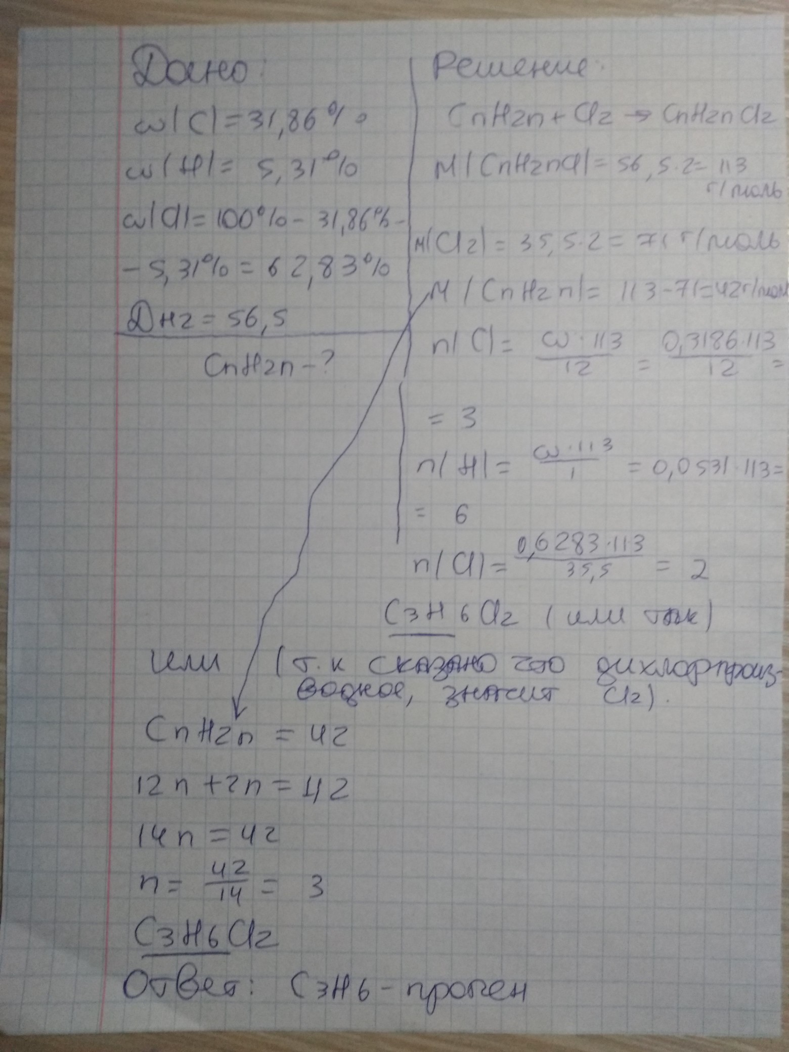 Дихлорпроизводное углеводорода с плотностью по водороду 56,5 имеет следующий состав: углерод – 31,86%, водород – 5,31%, оставшаяся массовая доля приходится на хлор. Определите формулу алкена, который был прохлорирован