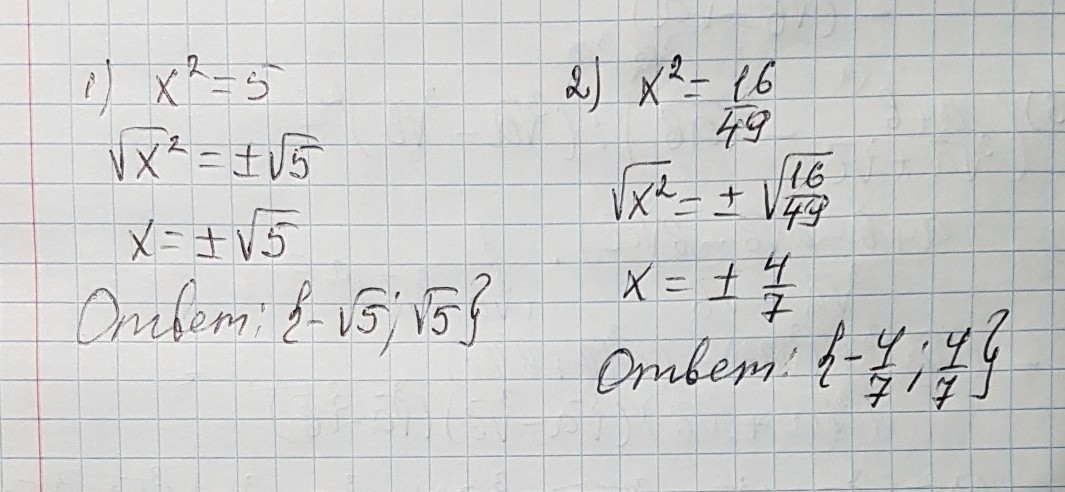 решить неполное квадратное уравнение 1)x^2=5, 2)x^216/49
