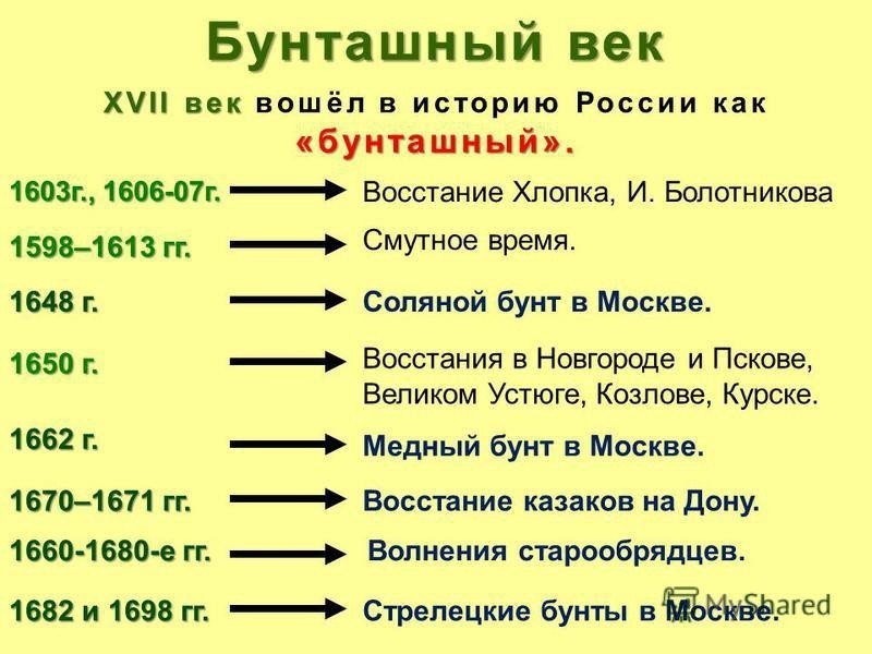 1603.1606-07 восстания хлопка Болотникова 1598-1613 смутное время 1648 соляной бунт 1650 восстание в Новгороде и пскове 1662 медный бунт в Москве 1670-71 восстание казаков на дону 1660-1680 восстановления старообрядцев1682и1682 стрелецкие бунты в Москве
