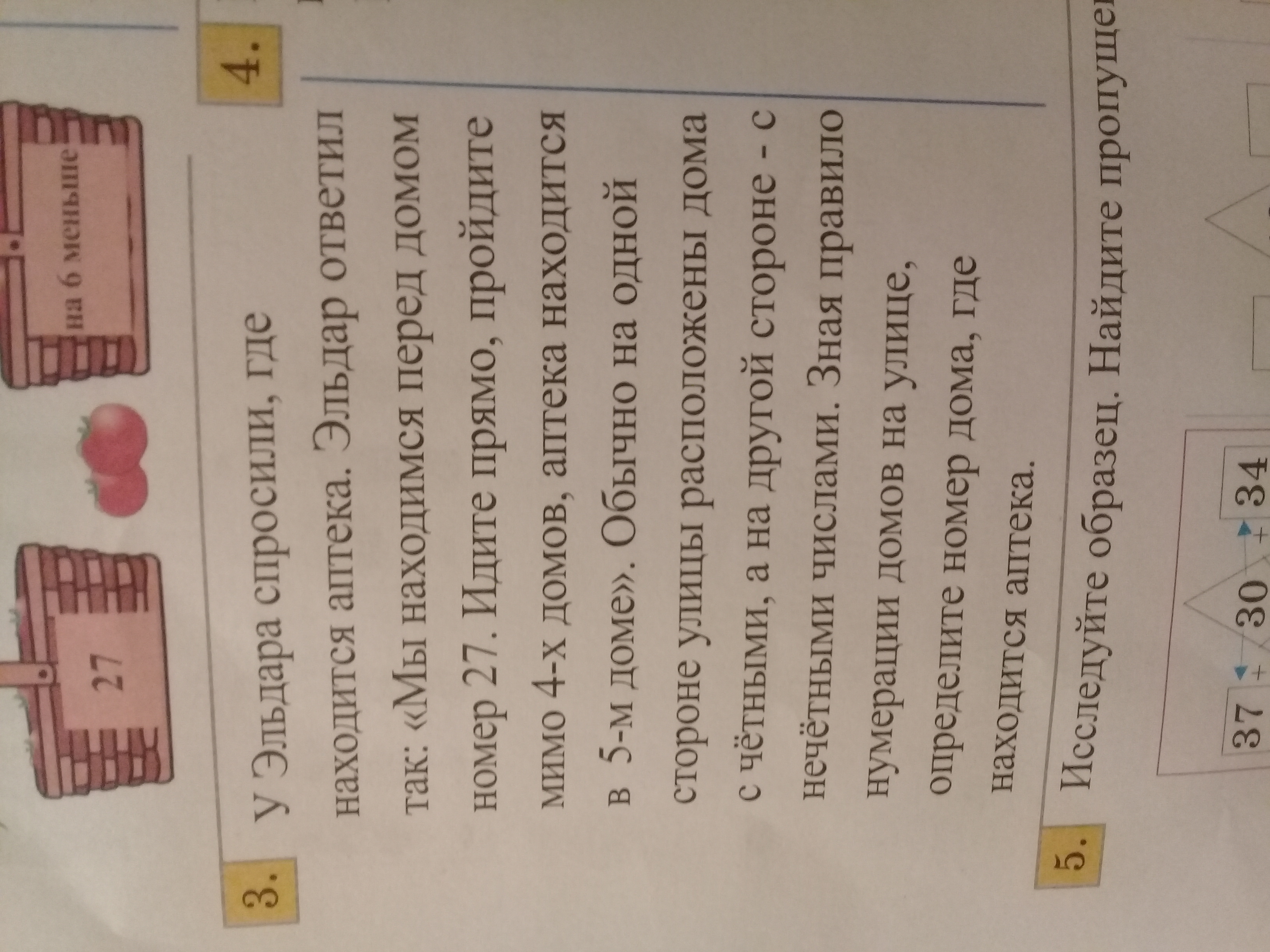 Аптека будет находиться через 5 домов. Если мы стоим перед 27 домом, а аптека от 27 дома удалена на 4 дома, и находится в 5 доме.