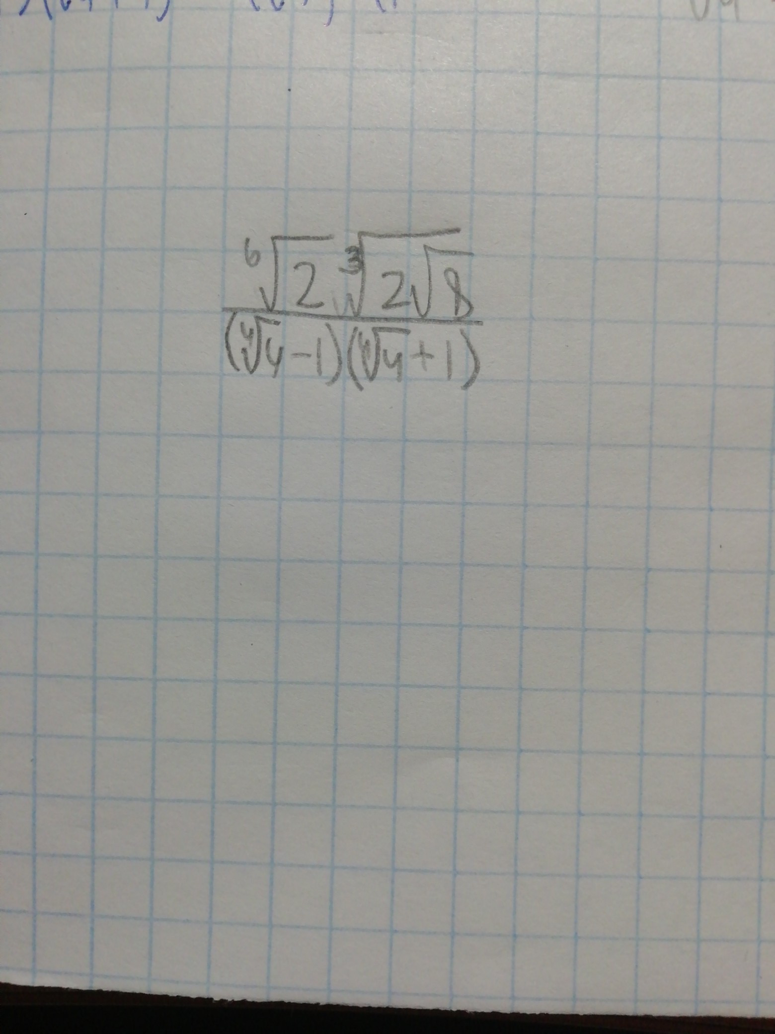 frac{ sqrt[6]{2}  times  sqrt[3]{2 sqrt{8} } }{( sqrt[4]{4} - 1)( sqrt[4]{4}  + 1}  =  frac{ {2}^{ frac{1}{6}}  times  {2}^{ frac{1}{3} }  times( {2}^{ frac{3}{2} } )^{ frac{1}{3} } }{( sqrt[4]{4})^{2}  -  {1}^{2}  }  =  frac{ {2}^{ frac{1}{6} } times  {2}^{ frac{1}{3} }   times  {2}^{ frac{1}{2} } }{ sqrt{4} - 1 }  =  {2}^{ frac{1}{6}  +  frac{1}{3} +  frac{1}{2}  }  =  {2}^{ frac{6}{6} }  = 2