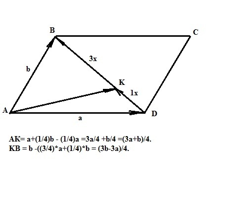 Вектор KB = AB-AK или KB = b -((3/4)*a+(1/4)*b = (3b-3a)/4.