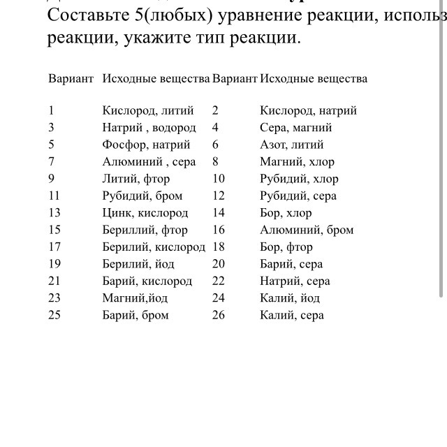 Составьте 5(любых) уравнение реакции, используя исходные вещества. Назовите продукты реакции, укажите тип реакции.