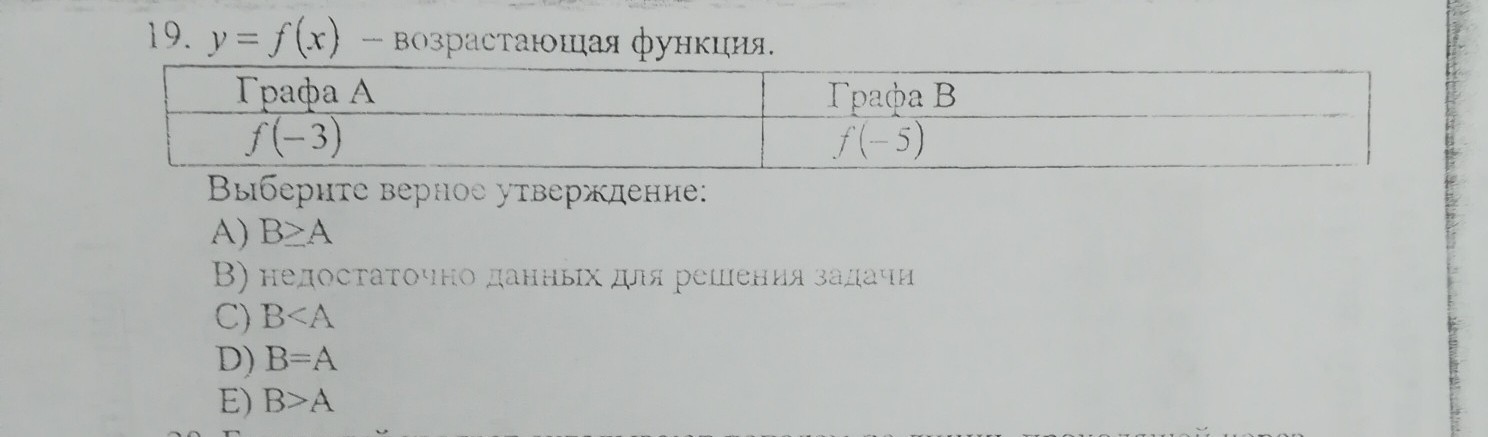 Так как функция возрастает, то чем больше значение аргумента, тем больше значение функции. -3 > -5, значит, f(-3) > f(-5), т. е. A > B.