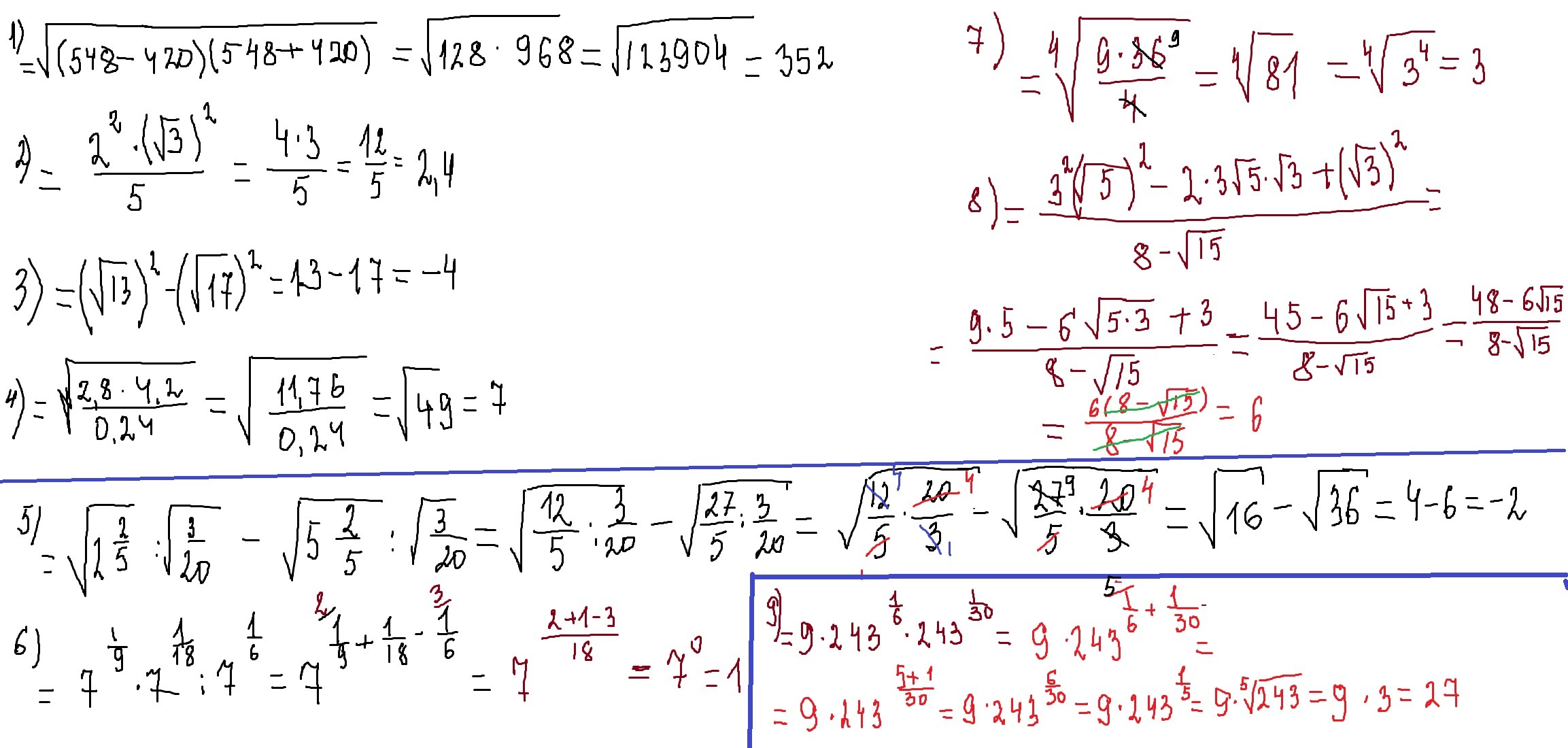 смотри решение хотя бы нескольких примеров.применяем св-ва корней и таблицу степеней чисел