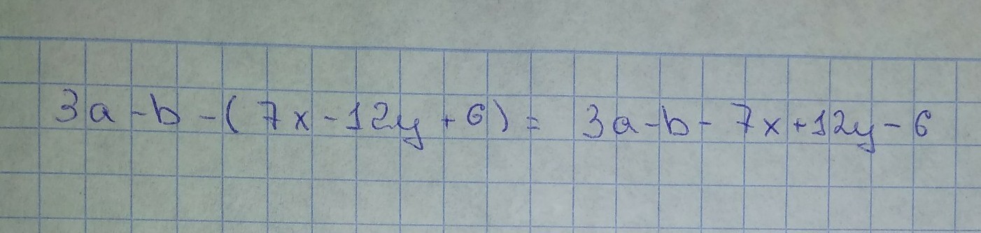 Честно, сейчас не буду уверен в своём ответе, но мне кажется, что ответ : 3a-b-7x+12-6, так как, если минус стоит перед скобками стоит минус, то все знаки в скобке меняются на противоположные. Работает это только с минусом и плюсом.