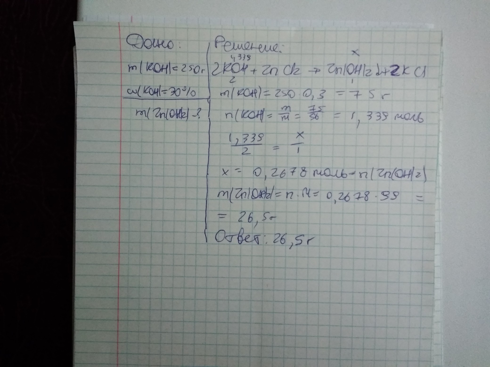 Рассчитайте массу осадка, если 250 г гидроксида калия, содержащего 30 % примесей, взаимодействует с хлоридом цинка.