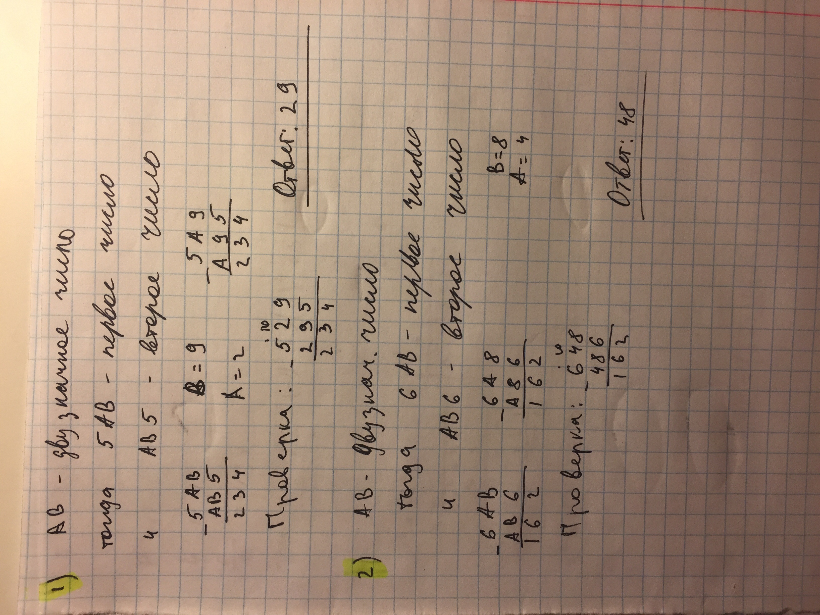 а) К двузначному числу приписали цифру 5 сначала слева, а потом справа - получили 2 трёхзначных числа, разность которых равна 234. Найдите двузначное число.