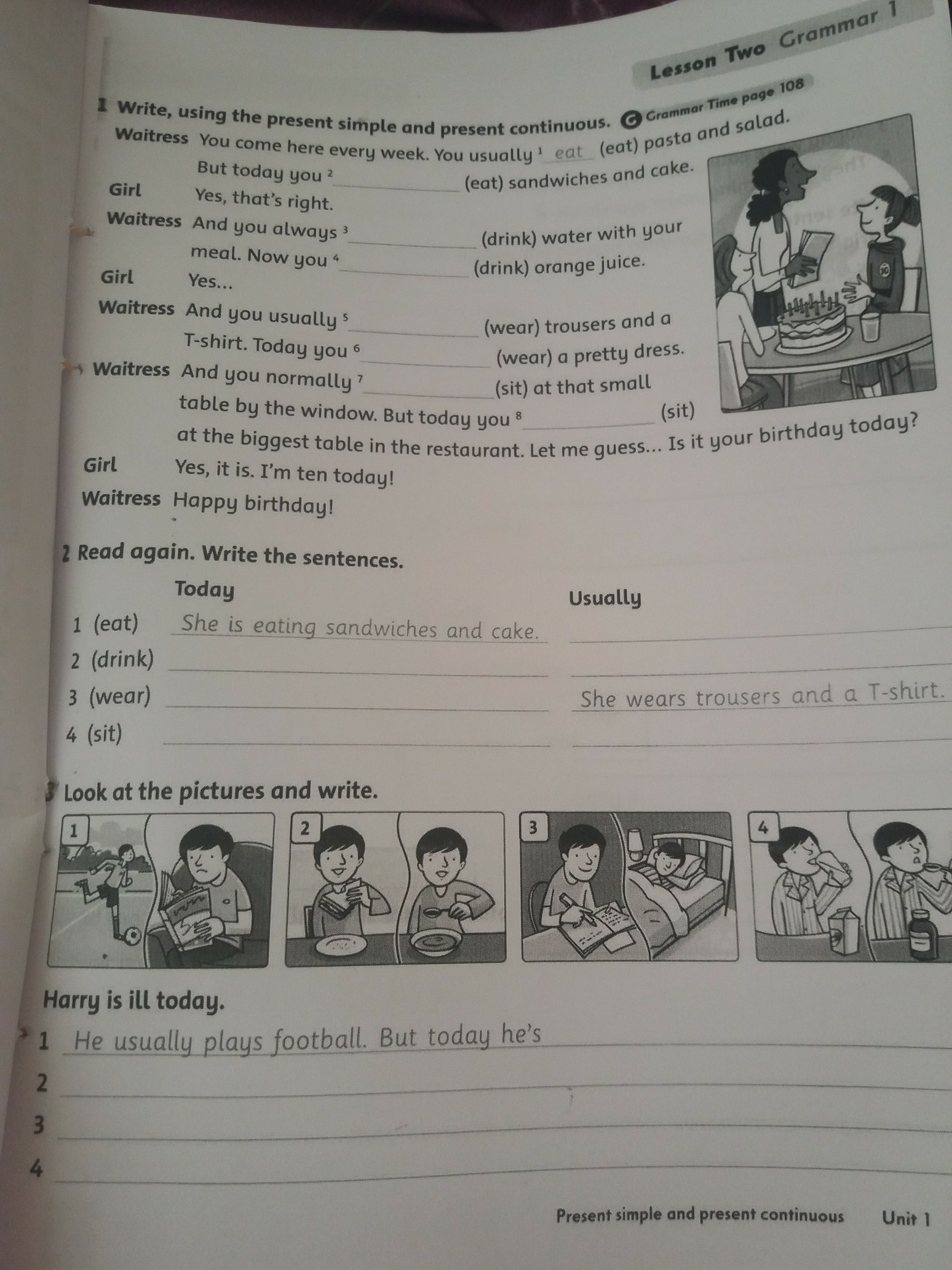 2) Today - She is drinking orange juice. Usually - She drinks water with her meal.