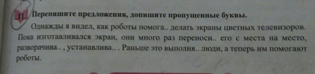 Однажды я видел, как роботы помогаЛИ делать экраны цветных телевизоров. Пока изготавливался экран, они много раз переносиЛИ его с места на место, разворачиваЛИ, устанавливаЛИ. Раньше это выполняЛИ люди, а теперь им помогают роботы.
