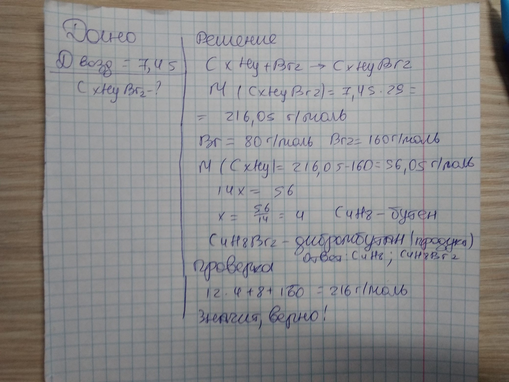Установите молекулярную формулу алкена и продукта взаимодействия его с избытком брома, если этот продукт реакции имеет относительную плотность по воздуху 7,45