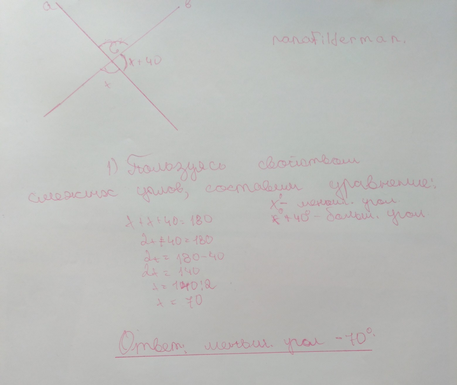 Разница двух кутов, полученных при пересечении двух прямых равно 40°. Найдите меньший из этих углов.