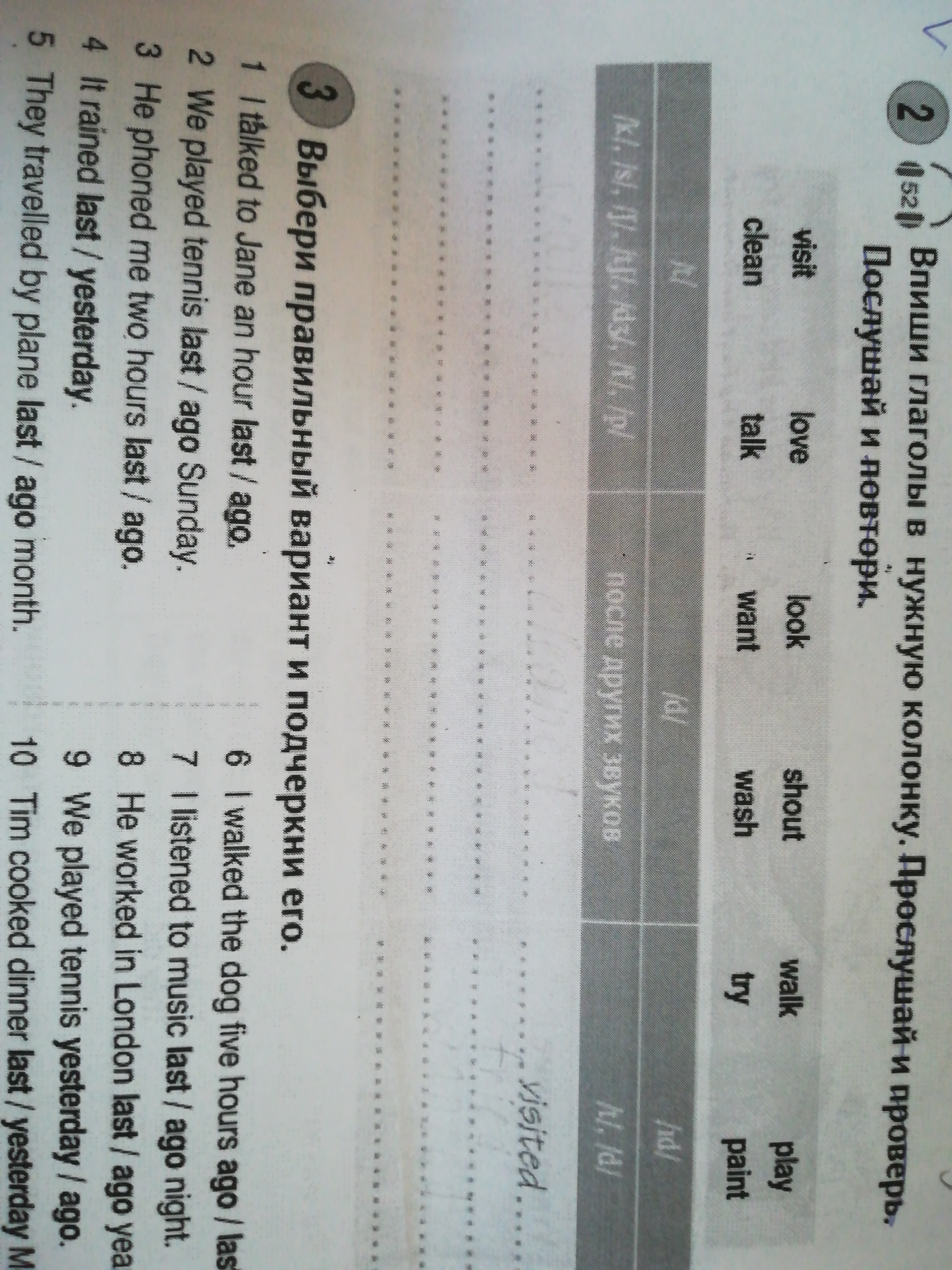2 колонка: loved, played, cleaned, washed, tryied