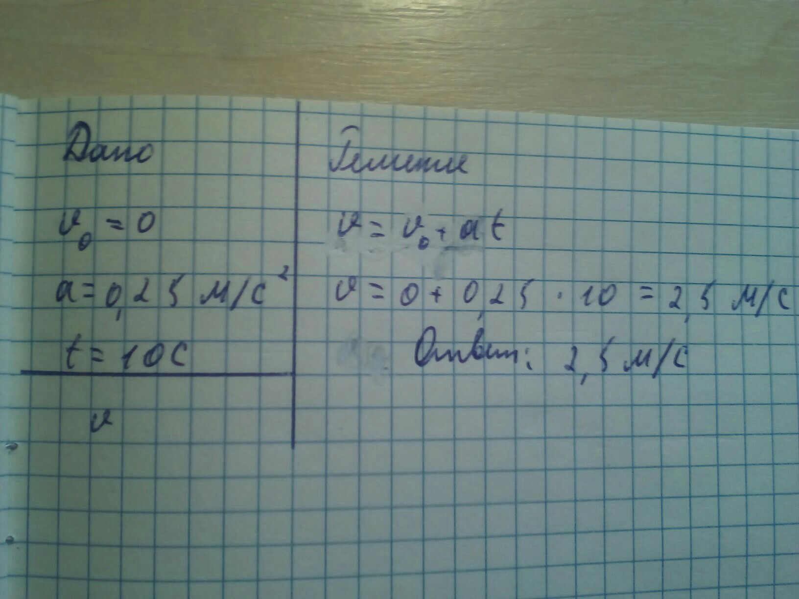 V=V0+at=0+0,25*10=2,5 м/с