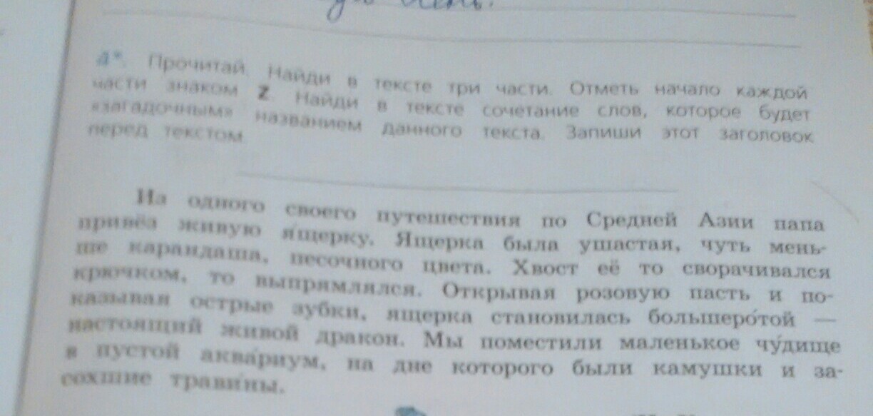 прочитай. Найди в тексте три части. Отметь начало каждой части знаком Z. Найди в тексте сочетания слов, которая будет загадочным названием данного текста Запиши этот заголовок перед текстом