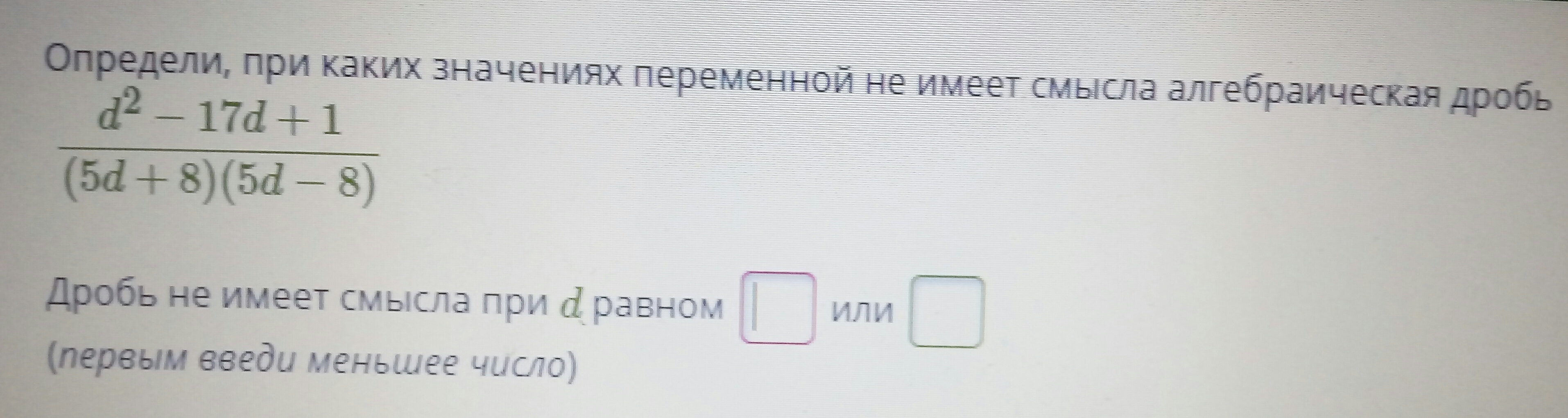 алгебраическая дробь не имеет смысла в том случае. если знаменатель равен 0. получаем: (5d+8)*(5d-8)=0. 5d+8=0 или 5d-8=0. d1= -8/5, d2=8/5. Ответ: дробь не имеет смысла при d1= -8/5, d2=8/5.