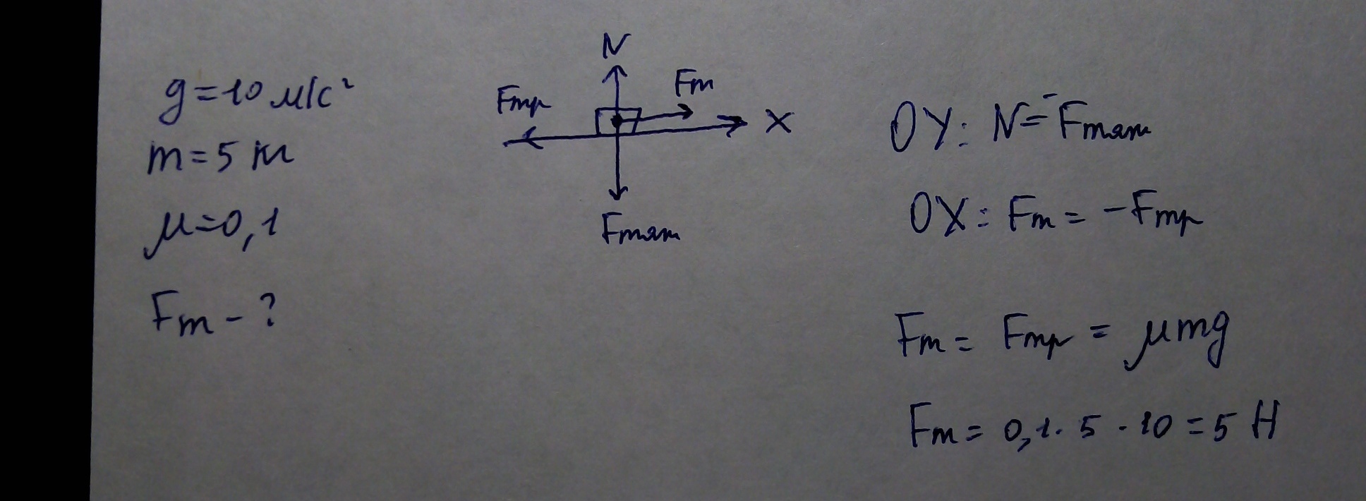 Тело массой 5 кг под действием вынуждающей силы F движется по горизонтальной поверхности равномерно прямолинейно. Чему равна вынуждающая сила F, если коэффициент силы трения равен 0,1?