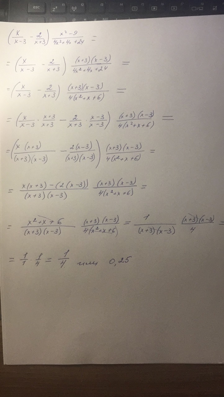 x(x+3)-2(x-3)/x^-9 *x^-9/4(x^+x+6)=x^+3x-2x+6/x^-9 *x^-9/4(x^+x+6)=(x^+x+6)(x^-9)/(x^-9) *4(x^+x+6)=1/4=0,25