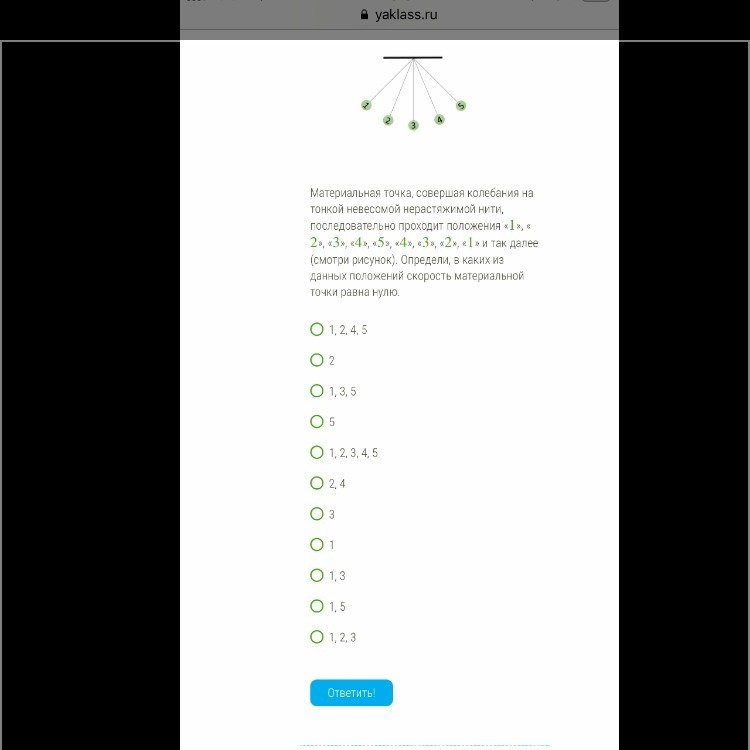 ПРОСТО ОТВЕТ С КРАТКИМ ОБЪЯСНЕНИЕМ!!!!Материальная точка, совершая колебания на тонкой невесомой нерастяжимой нити, последовательно проходит положения «1», «2», «3», «4», «5», «4», «3», «2», «1» и так далее (смотри рисунок). Определи, в каких из данных положений скорость материальной точки равна нулю.
