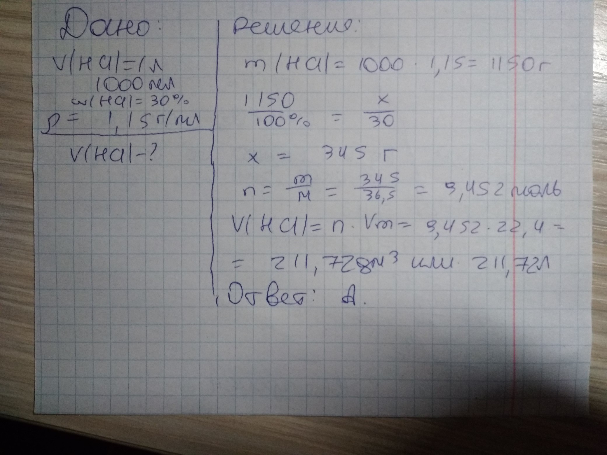 Для получения одного литра раствора хлороводородной кислоты с массовой долей HCl 30% (плотность равна 1,15 г/мл) потребуется объем (измеренный при н.у.) хлороводорода: А - 211,72л; Б - 21,1л; В - 0,805л; Г - 0,94л