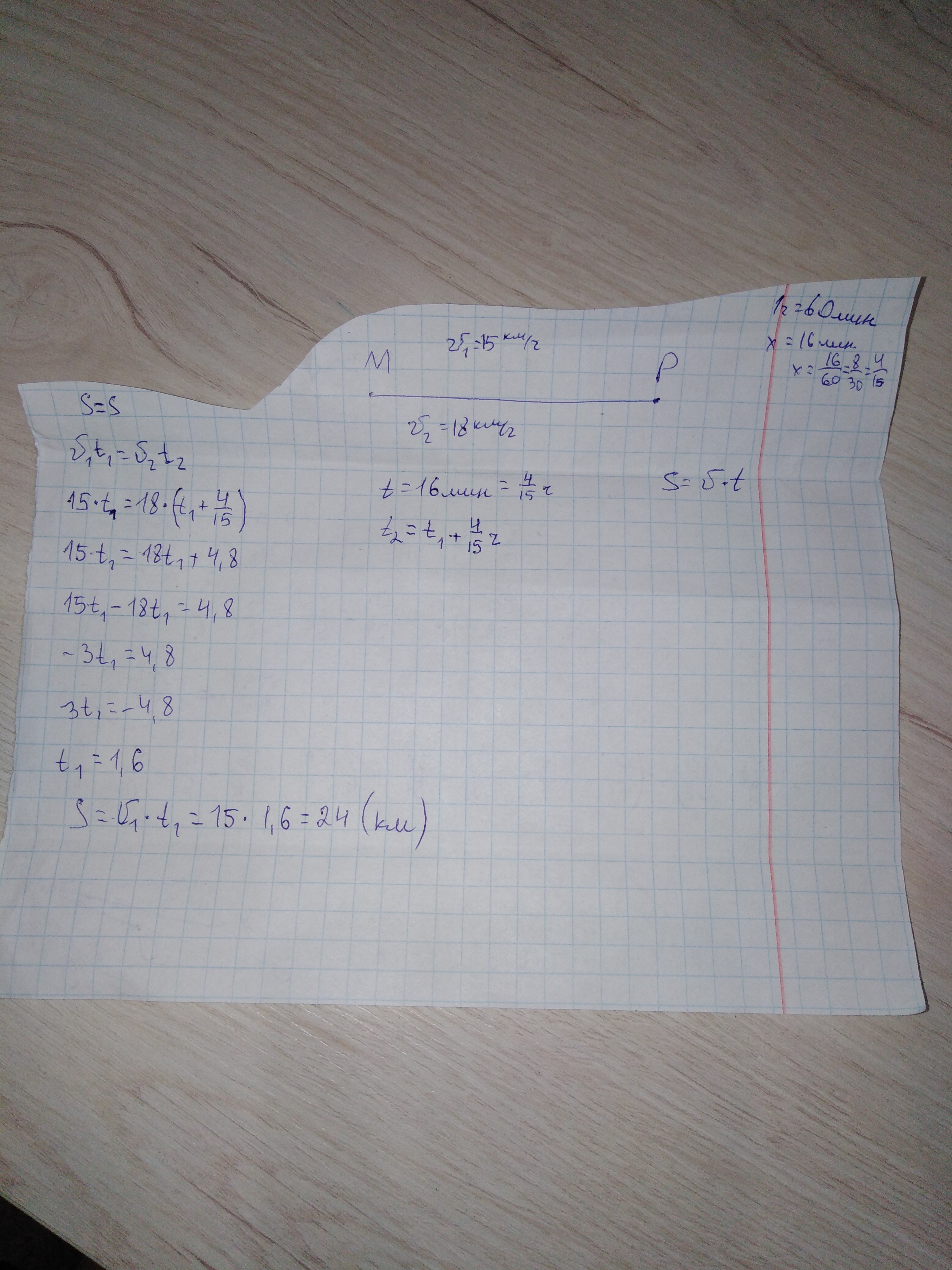 Из пункта M и P со скоростью 15кмч, через 16 минут за ним выехал второй велосипедист со скоростьъ 18км/ч. Чему равно расстояние между пунктами M и P, если известно, что второй велосепедист прибыл в P одновременно с первым?