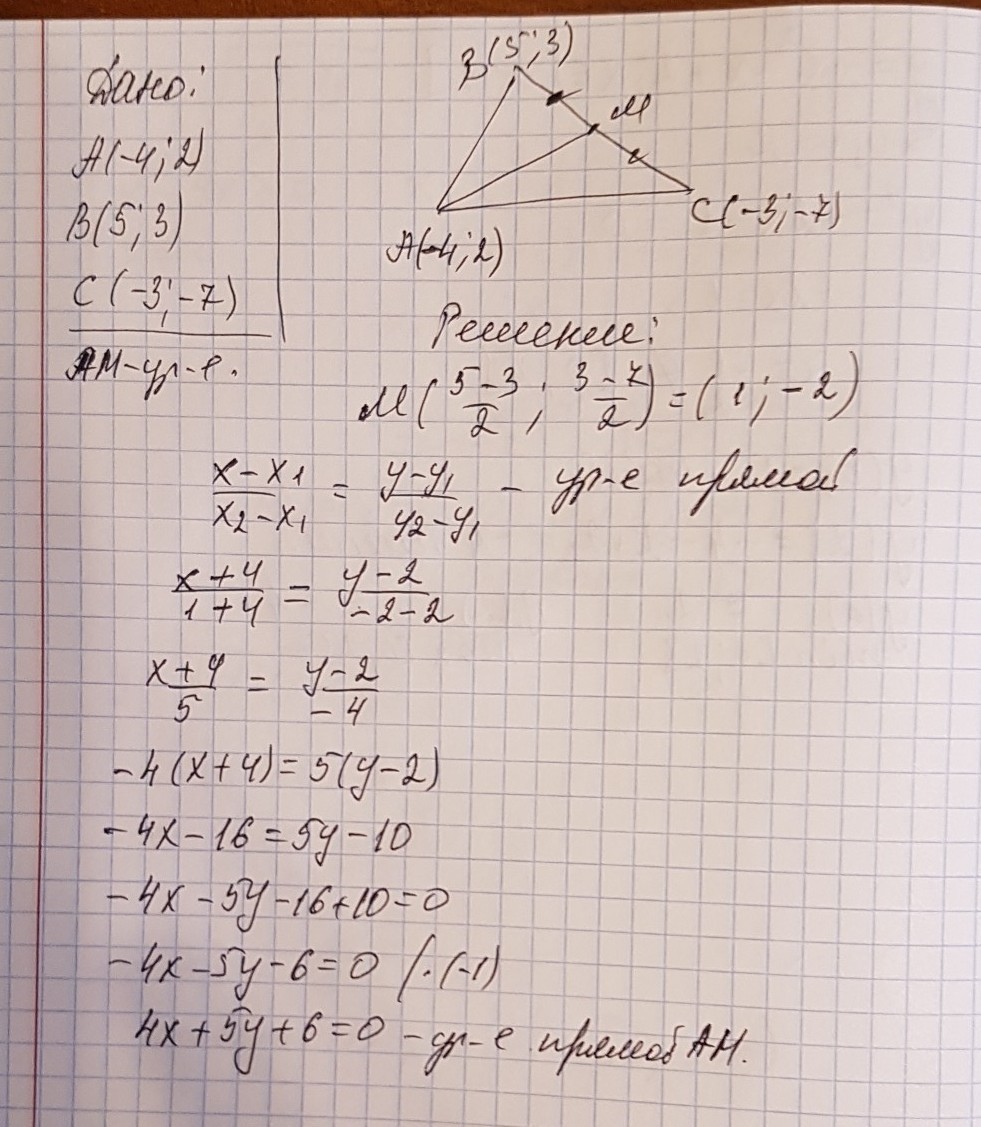 Отрезок АМ - медиана треугольника с вершинами в точках А (-4; 2). B (5; 3) и С - 3; -7). Составьте уравнение прямой АM.