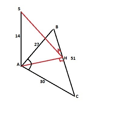 из вершины большего угла треугольника к его плоскости проведён перпендикуляр равный 14см. Определить расстояние от концов перпендикуляра до противолежащей стороны треугольника, стороны которого равны 27см, 30см, 51см
