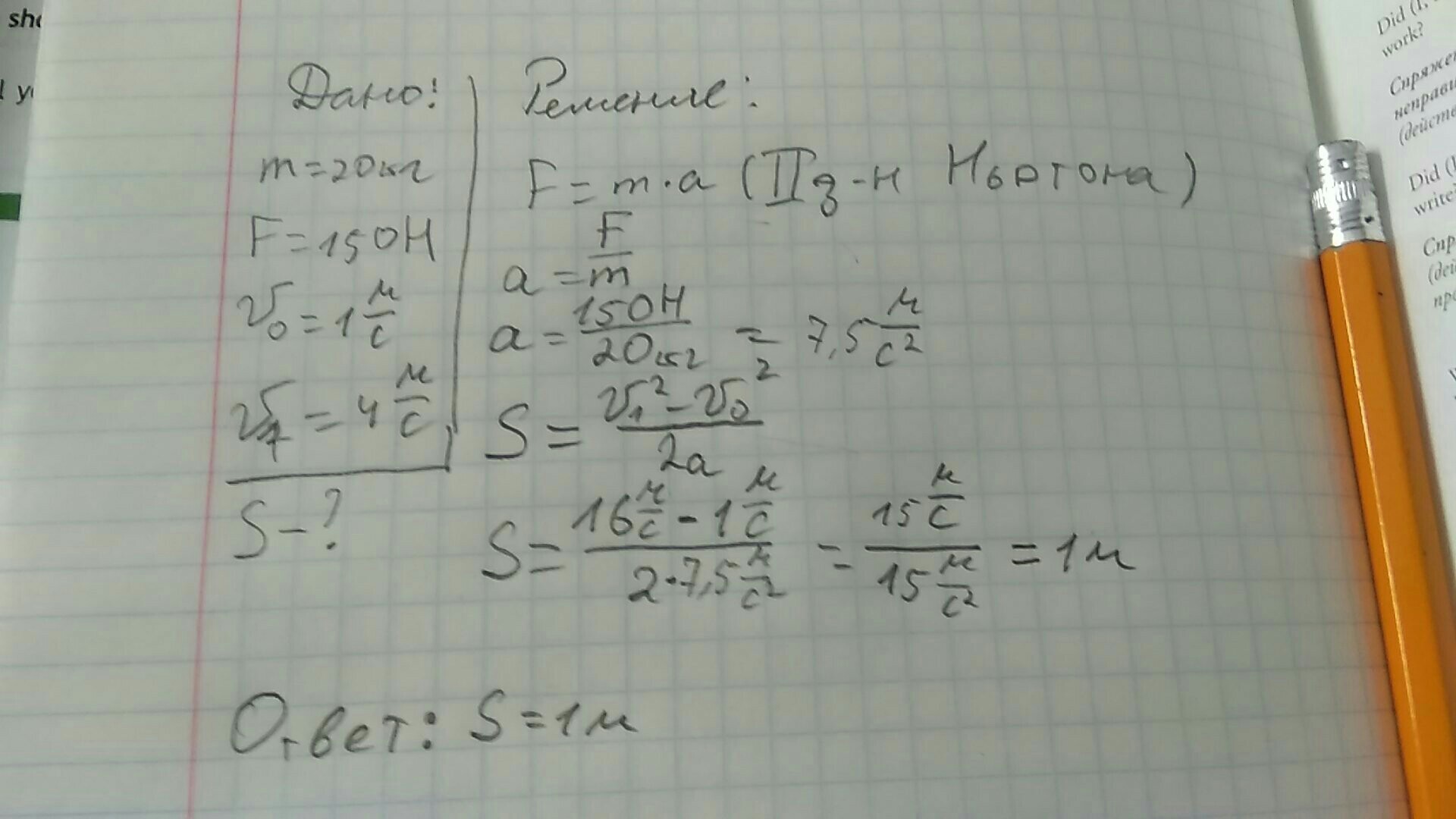 Тело массой 20 кг под действием силы 150 Н изменяет свою скорость от 1м/с до 4м/с.