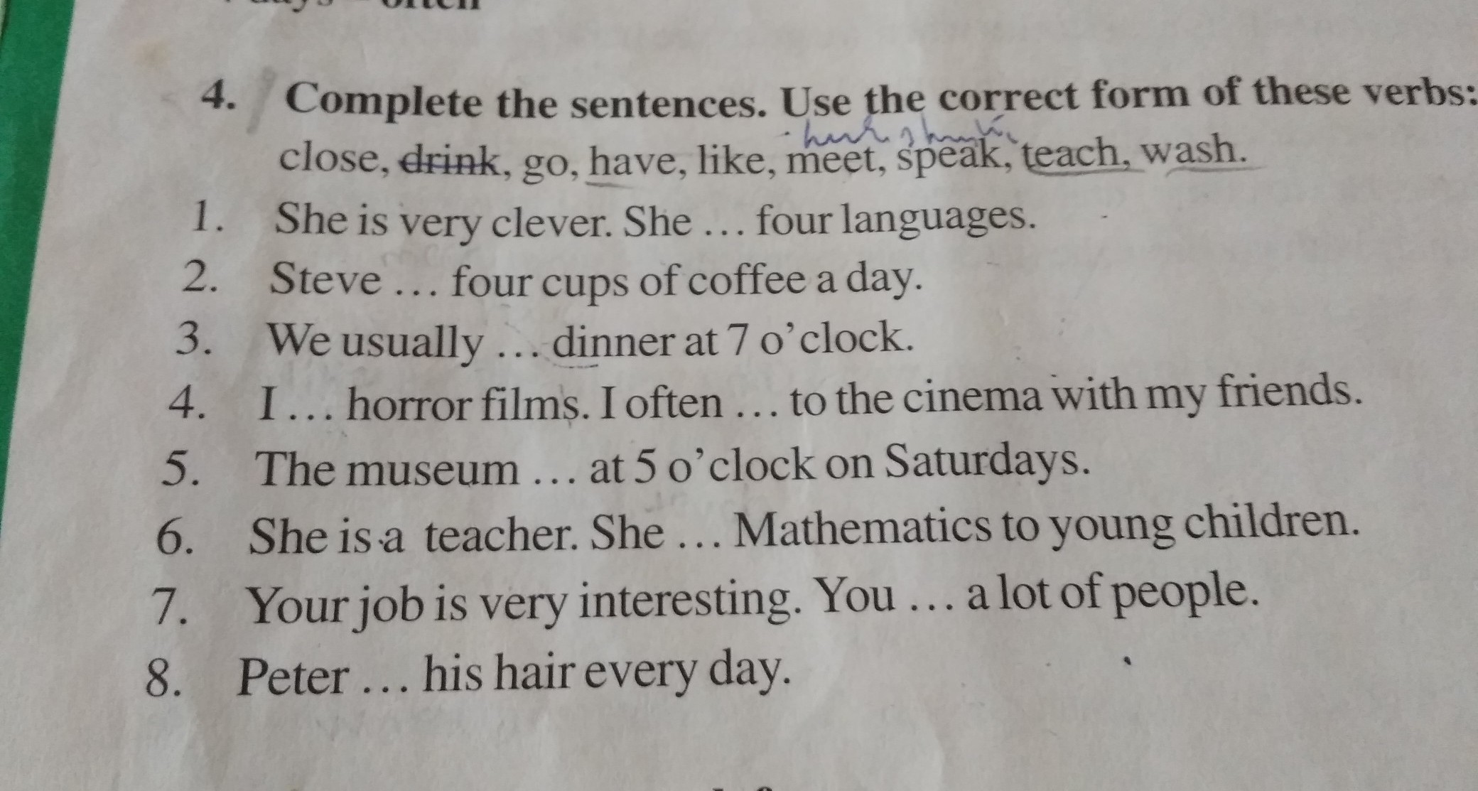 speaks, drinks, have, like, go, closes, teaches, meet, washes.