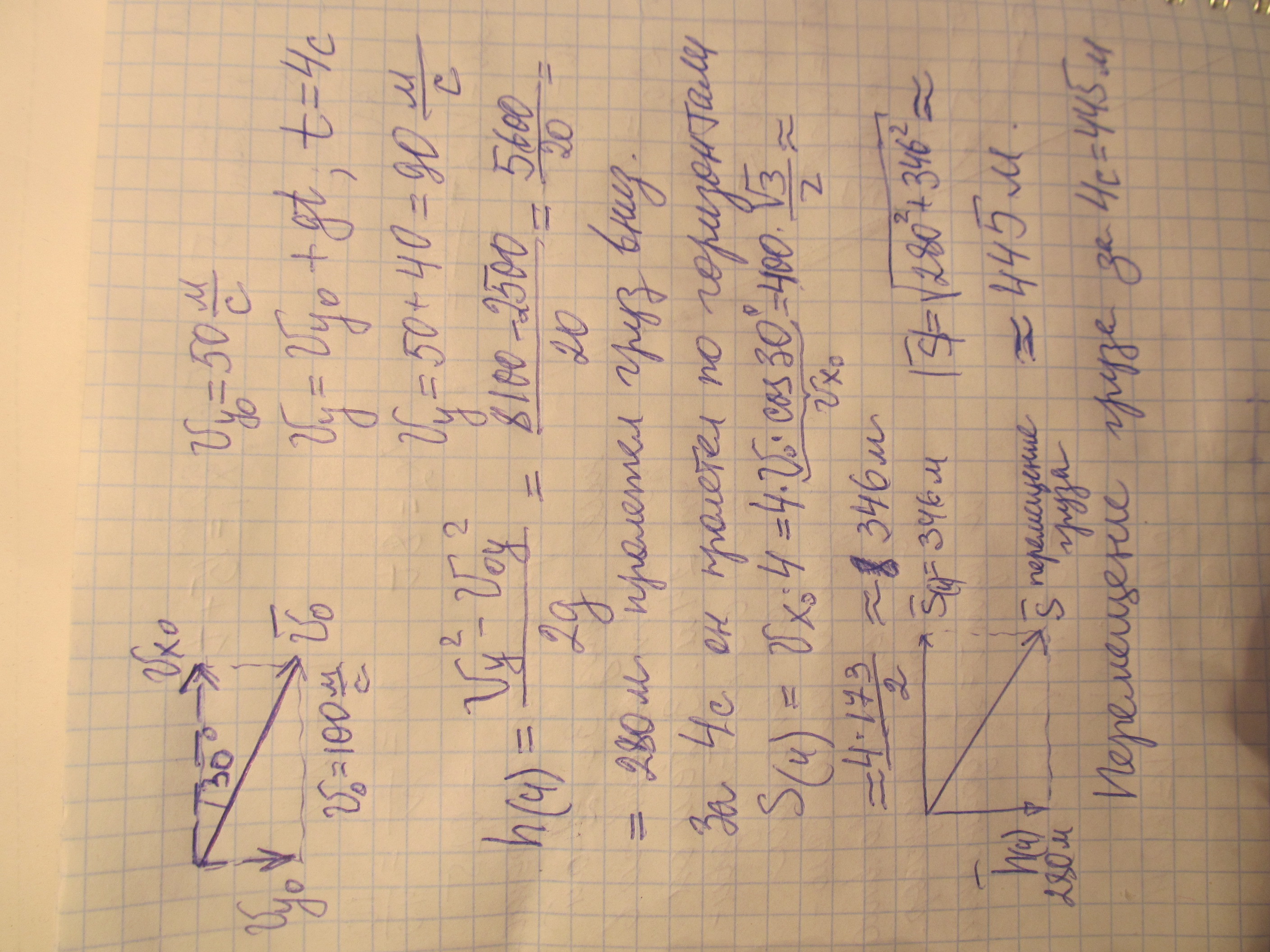 Самодёт движется вниз под углом 30 градусов к горизонту со скоростью 100 метров в секунду . Из него выпал груз , который коснулся земли через 4 секунд . Каковопермещение груза ?
