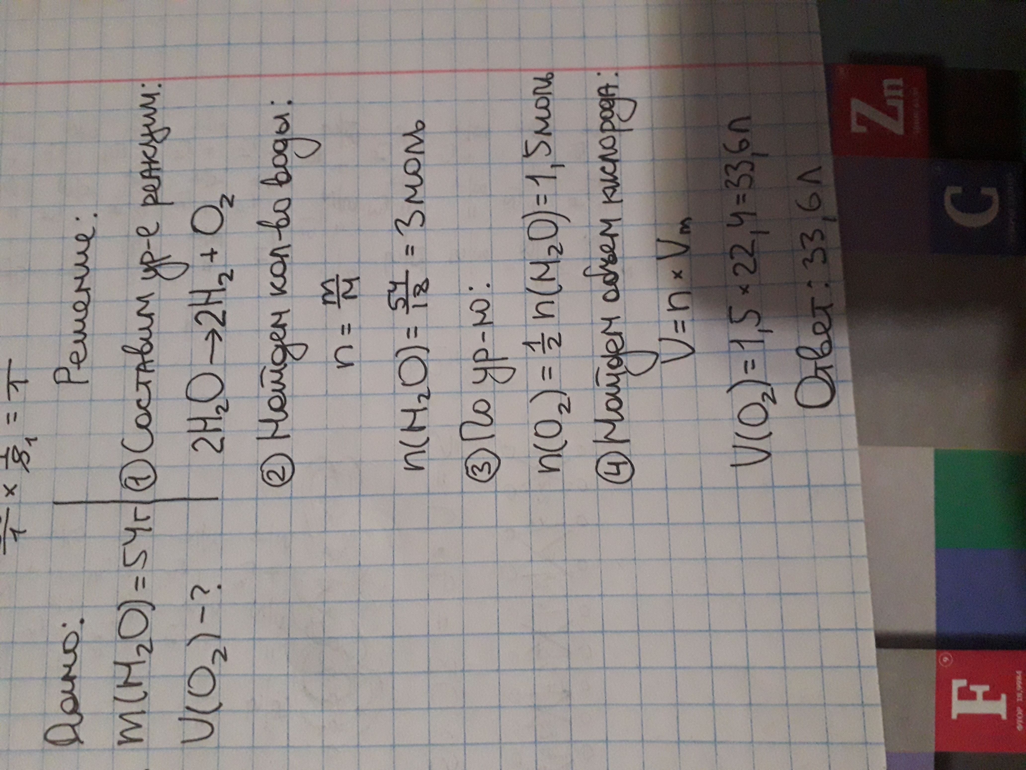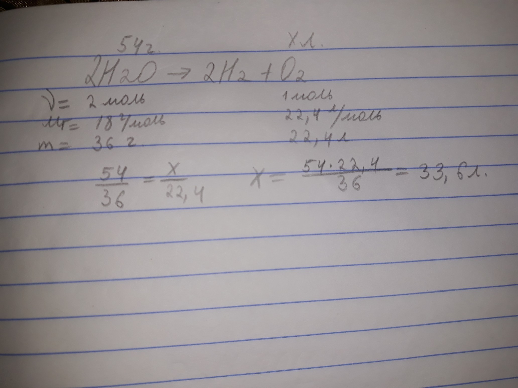 Определить объем кислорода, который образуется при разложении воды массой 54 г под действием электрического тока