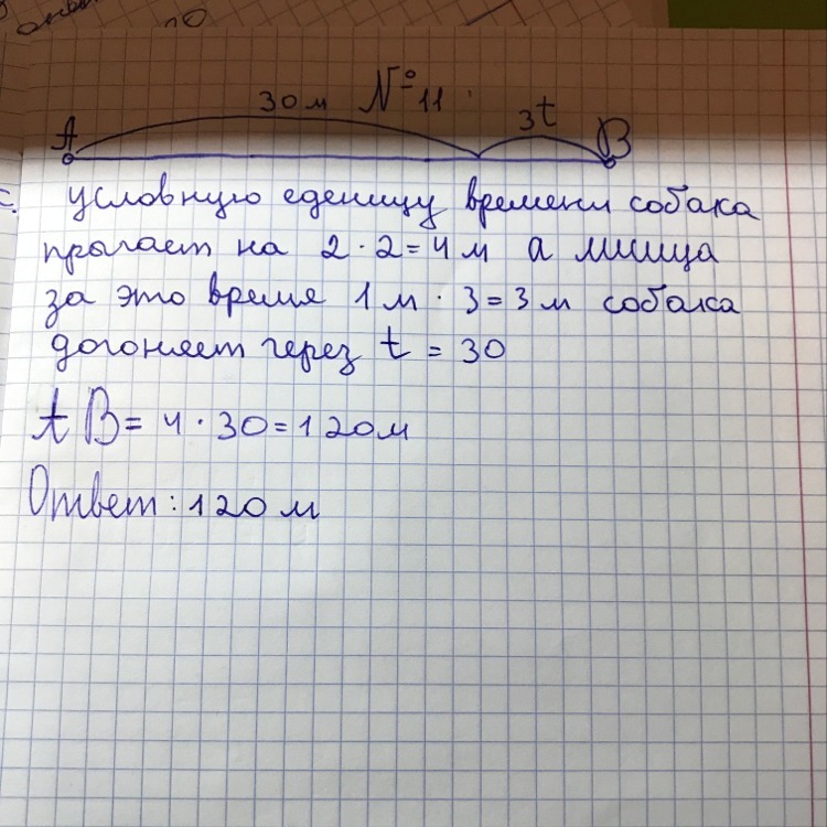Собака , находясь в точке А , попалась за лисицей , которая оыла на расстоянии 30 м от сооаки , прыжок сооаки равен 2 м , а прыжок лисицы - 1 м . Собака делает два прыжка в то время , когда лисица делает три прыжка . На каком расстоянии от точки А собака нагонит лисицу ?