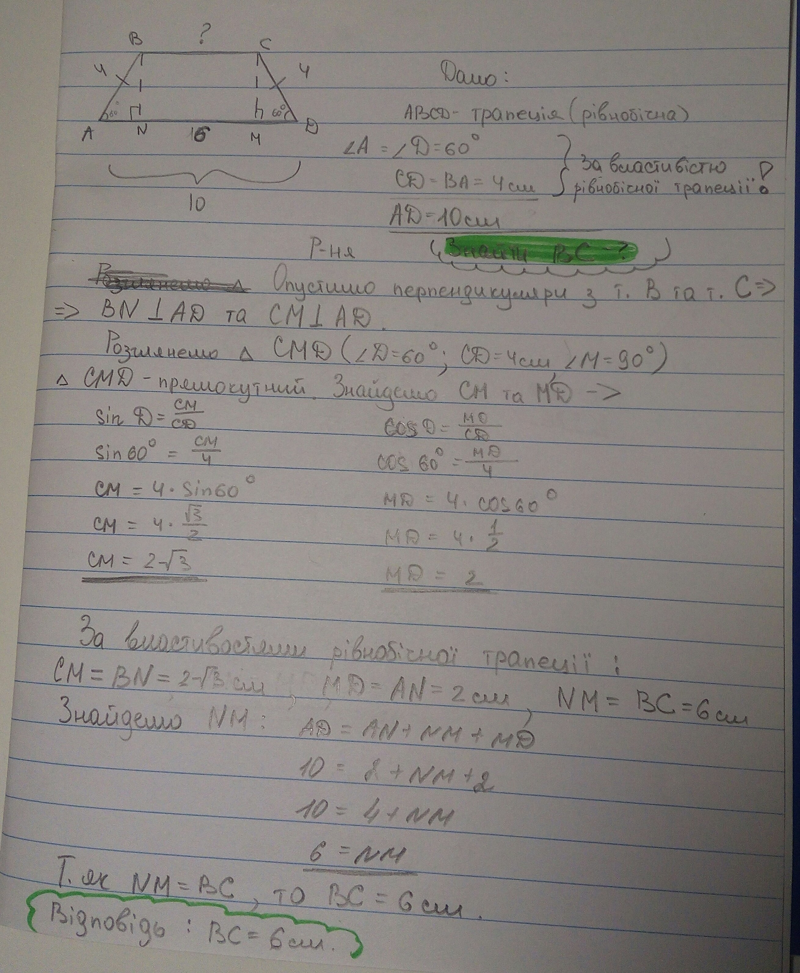 у рівнобічній трапеції більша основа дорівнюе 10 см,бічна сторона 4см ,а кут між ними 60 градусов. Знайдіть меншу основу трапеції