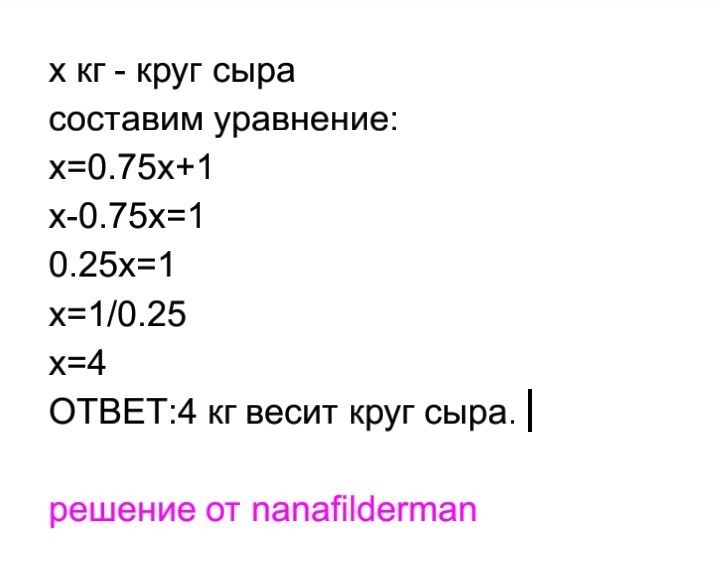 На одну чашу весов положили круг сыра , а на другую чашу весов 0,75 такого же круга и еще килограммовую гирю установилось равновесие . Сколько весит круг сыра ?