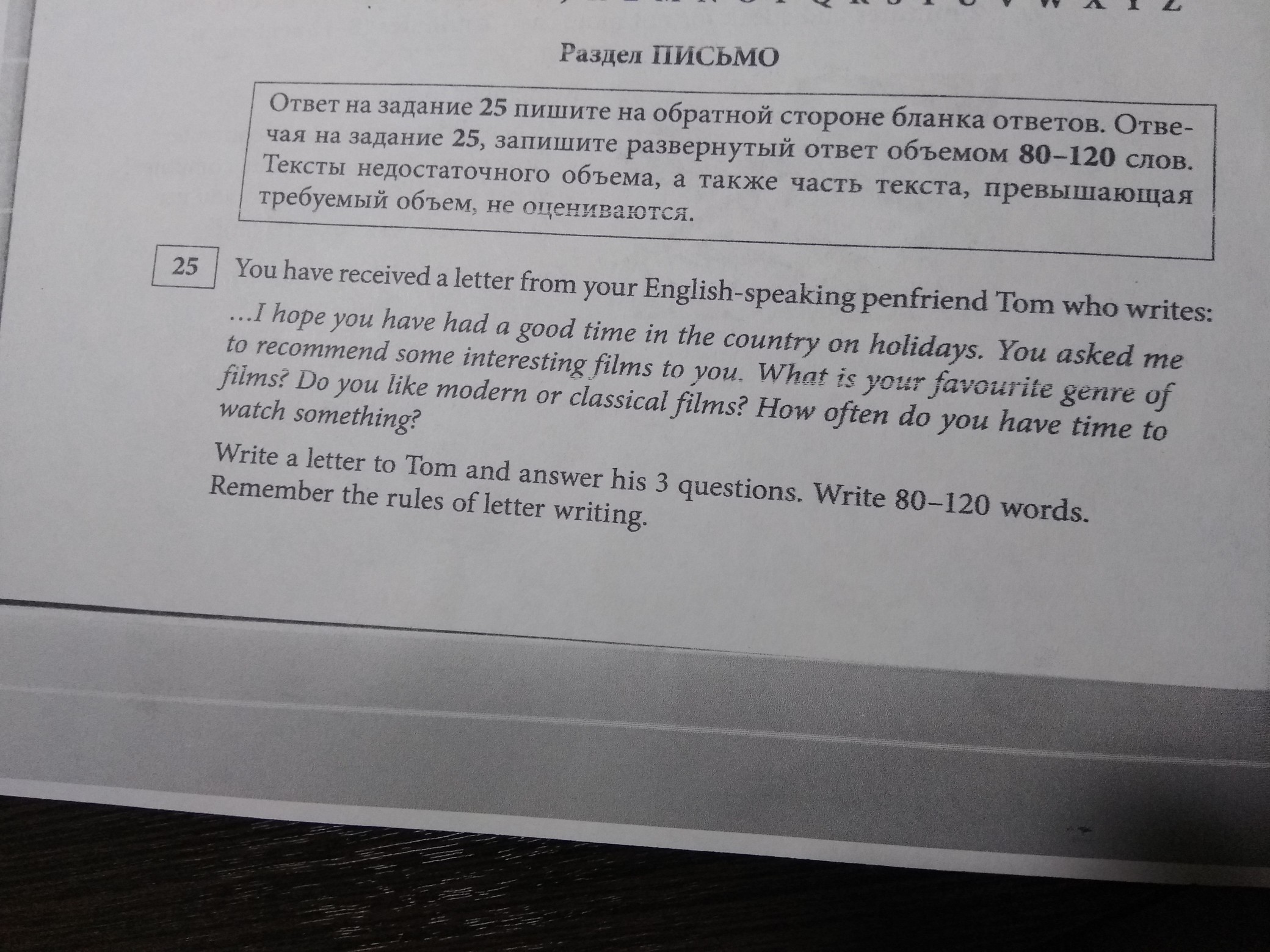 Hello Tom, thanks for your letter, and now, I want to answer your questions. at first, my favorite genre of films is comedy and fantasy because I really like all that jokes and strange creatures. I like all films, it can be old one or something modern, it's great, all that old and classical atmosphere. And the last, I have time not always, but my friends and I always see films on Saturday. I hope, you will answer me soon. All the best, your (твое имя)
