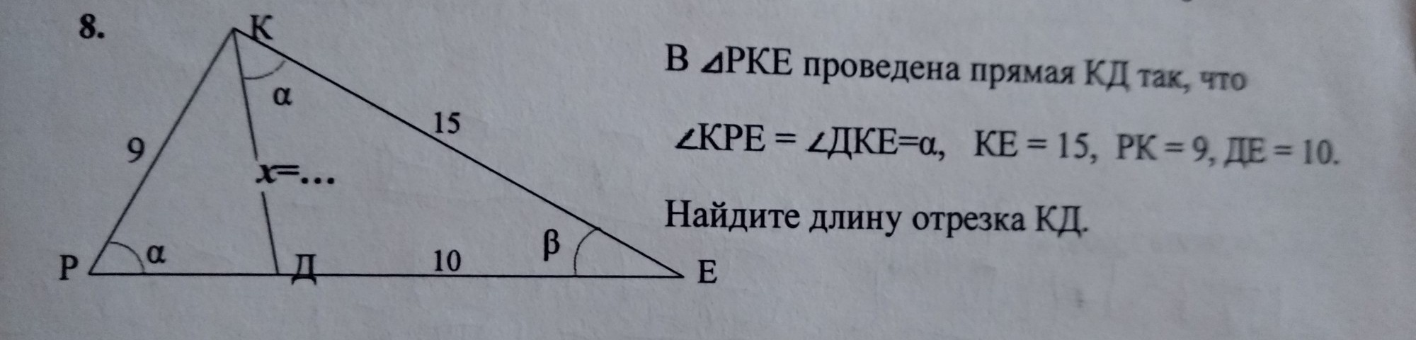 х=ДЕ*РК/КЕ=10*9/15=6