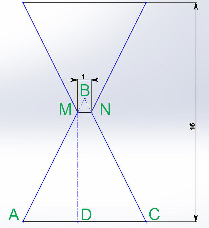 (где h - высота, на рисунке MD=16/2=8 см; r - верхний радиус, на рисунке r=MN/2=1/2=0,5 см, R - радиус основания, на рисунке R=AC/2=?)