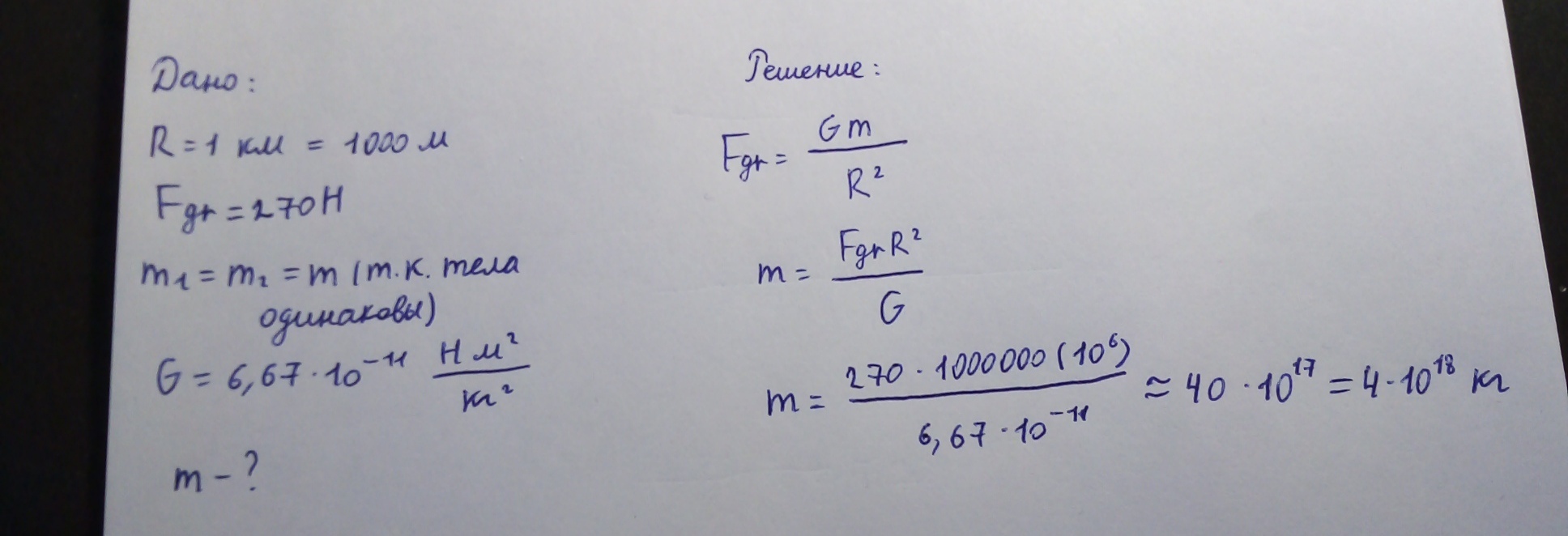 Какой должна быть масса каждого из двух одинаковых тел, чтобы на рассточнии 1км, они притягиыались с силой 270H. Только можно с Дано!