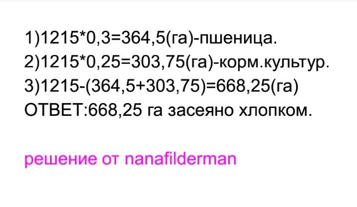 акционерное общество имеет 1215 га засеянной земли. пшеница занимает 30% всей площади, кормовые культуры 25% всей площади, а остальное хлопок. сколько гектаров земли засеяно хлопком?