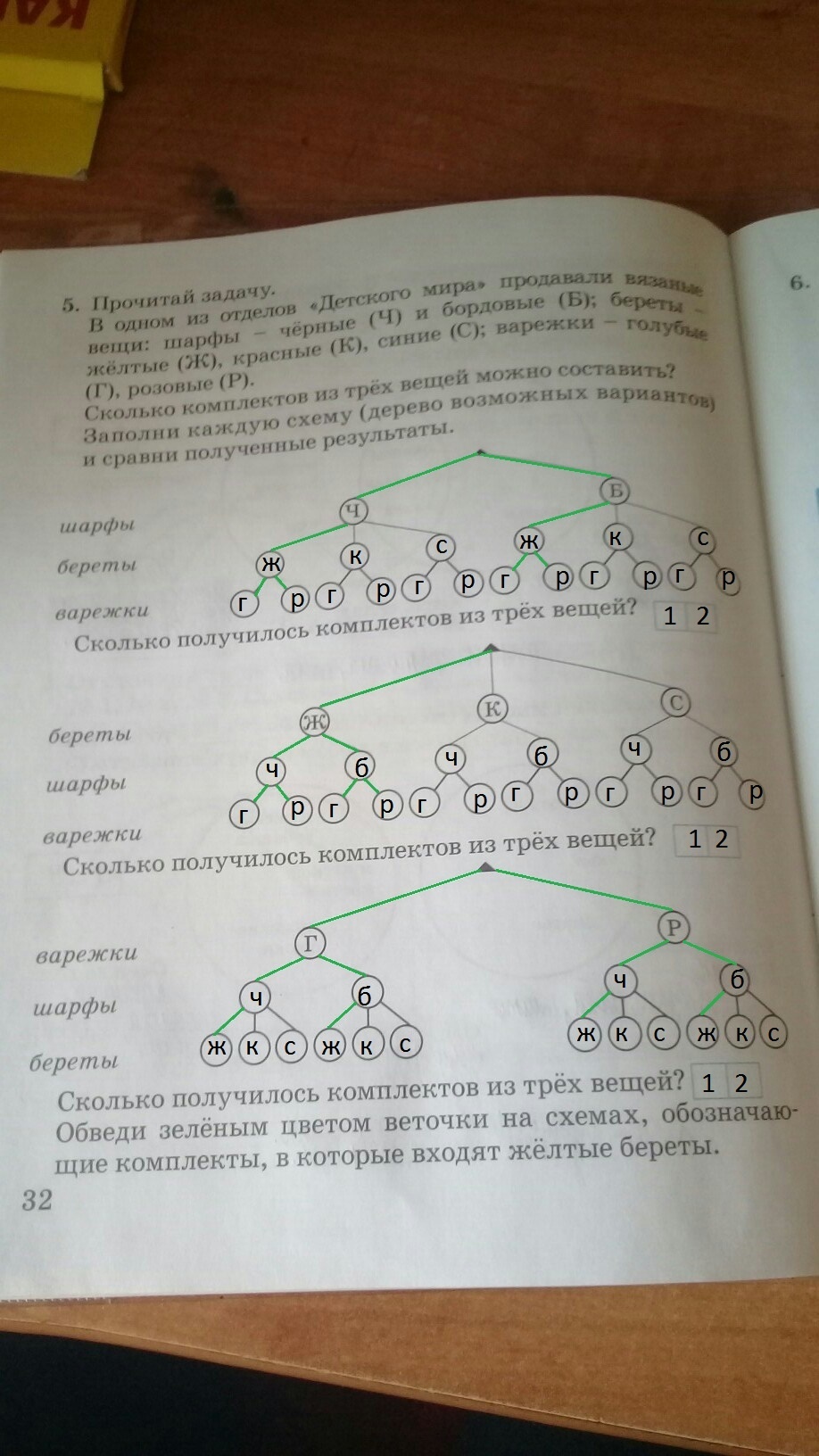 Прочитай задачу В одном из отделов Детского мира продавали вязаные вещи шарфы и чёрные ч скобках и бордовые береты желтые красные синие варежки голубые г розовые сколько комплектов из трёх вещей можно составить заполни каждую схему дерево возможных вариантов и Сравни полученные результаты