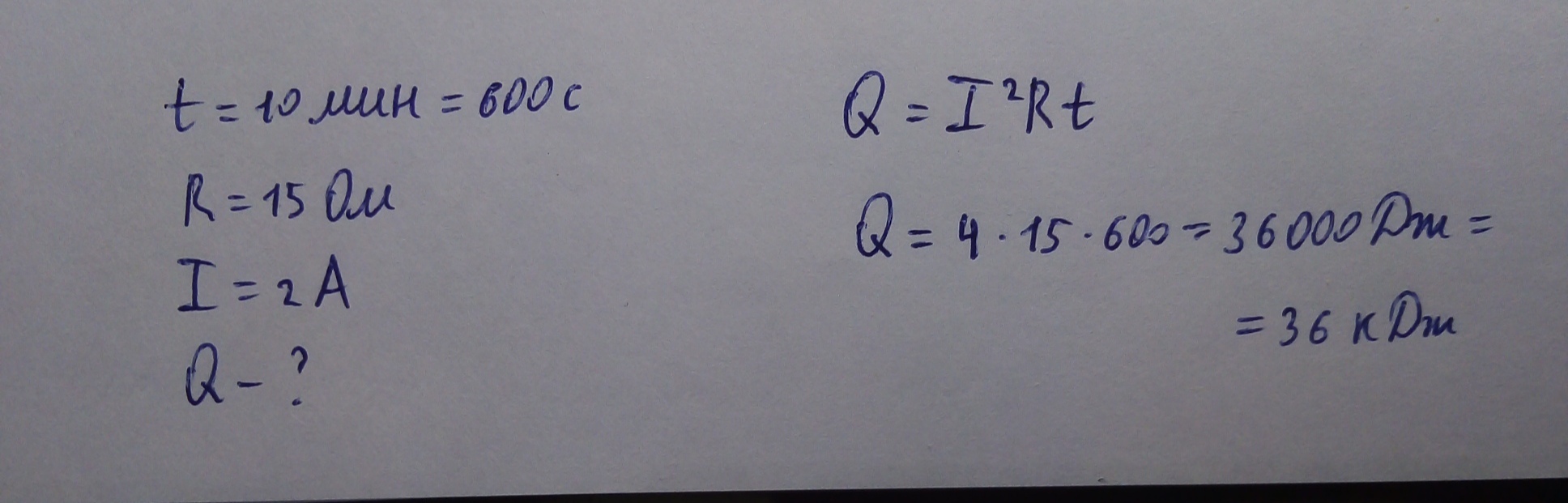 какое количество теплоты выделит за 10 мин. проволочная спираль сопротивлением 15 Ом. если сила тока в цепи 2А