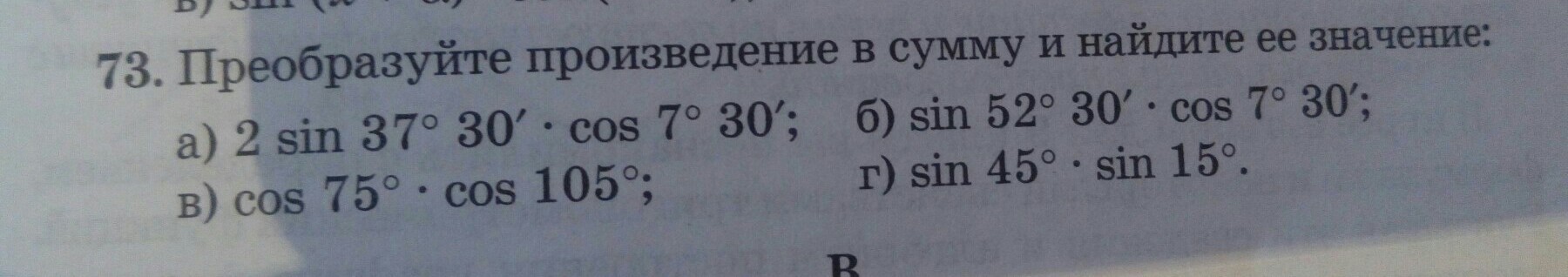 2Sin37°30' * Cos7°30' = 2 * 1/2 [Sin(37°30' - 7° 30') + Sin(37°30' + 7°30')]=