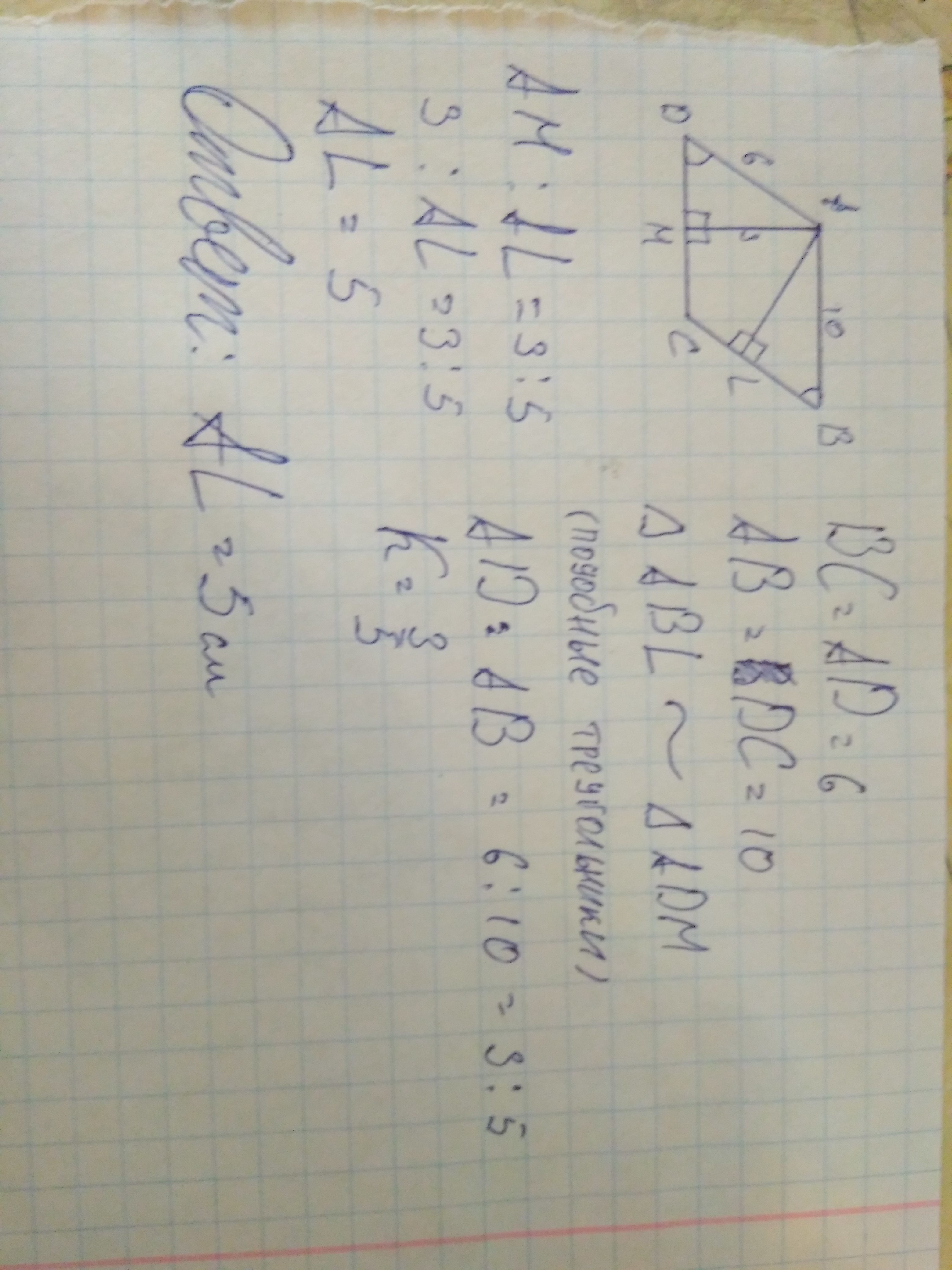 Из вершины тупого угла A параллелограмма ABCD проведены две высоты - AM=3 и AL (M э CD, L э BC). Найдите длину высоты AL, если BC=6 и CD=10.