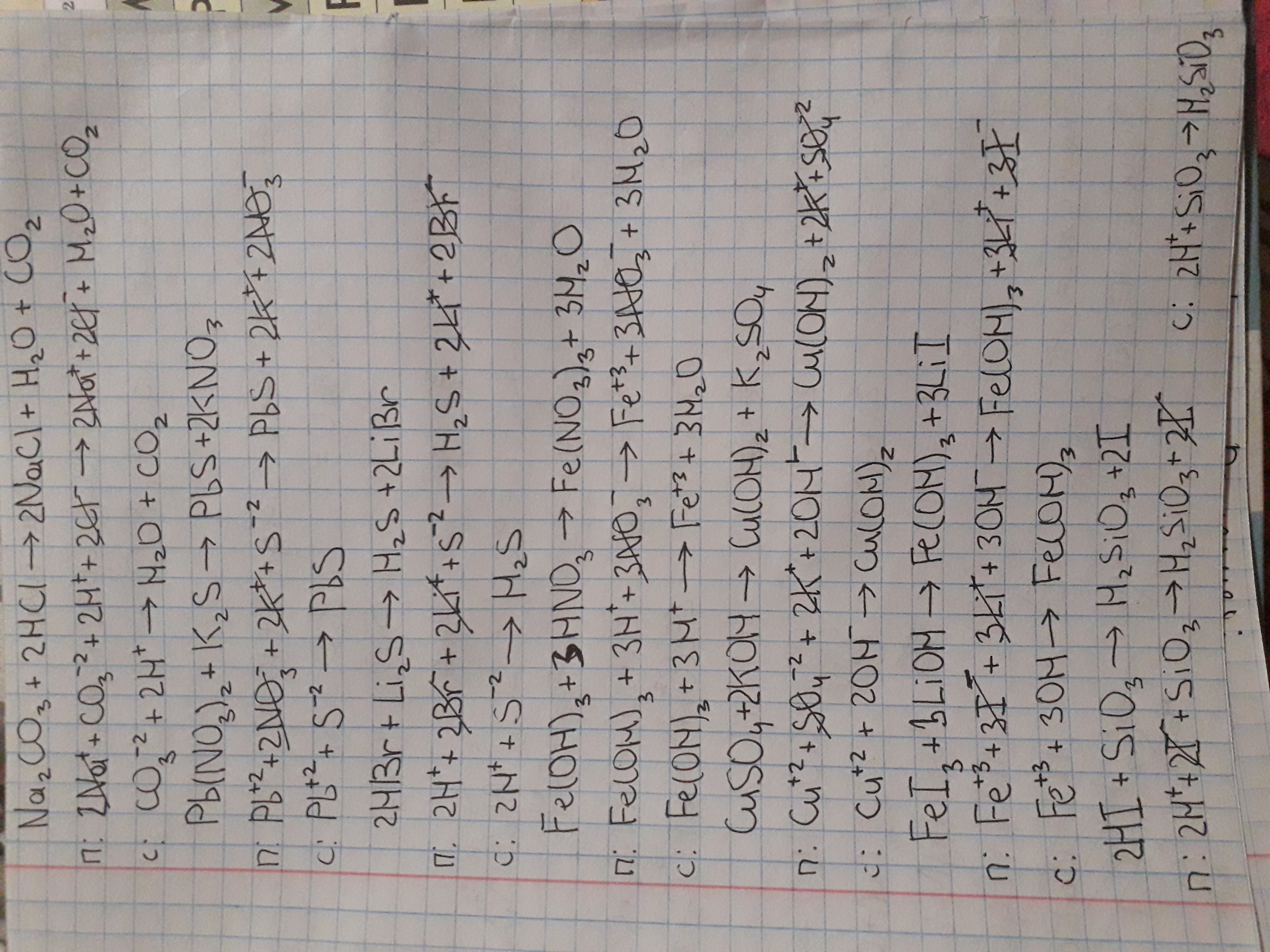 Напишите молекулярные и полные ионные уравнения,соответствующие следующим сокращенным ионным уравнениям: 1)Co3(2-)+2H(+)=H2O+CO2 2)Pb(2+)+S(2-)=PbS 3)2H(-)+S(2-)=H2S 4)Fe(OH)3+6H(+)=Fe(3+)+3H2O 5)Cu(2+)+2OH=Cu(2+)+2OH(-) 6)Fe(3+)+3OH=Fe(OH)3 7)2H(+)+SiO3(2-)=H2SiO3