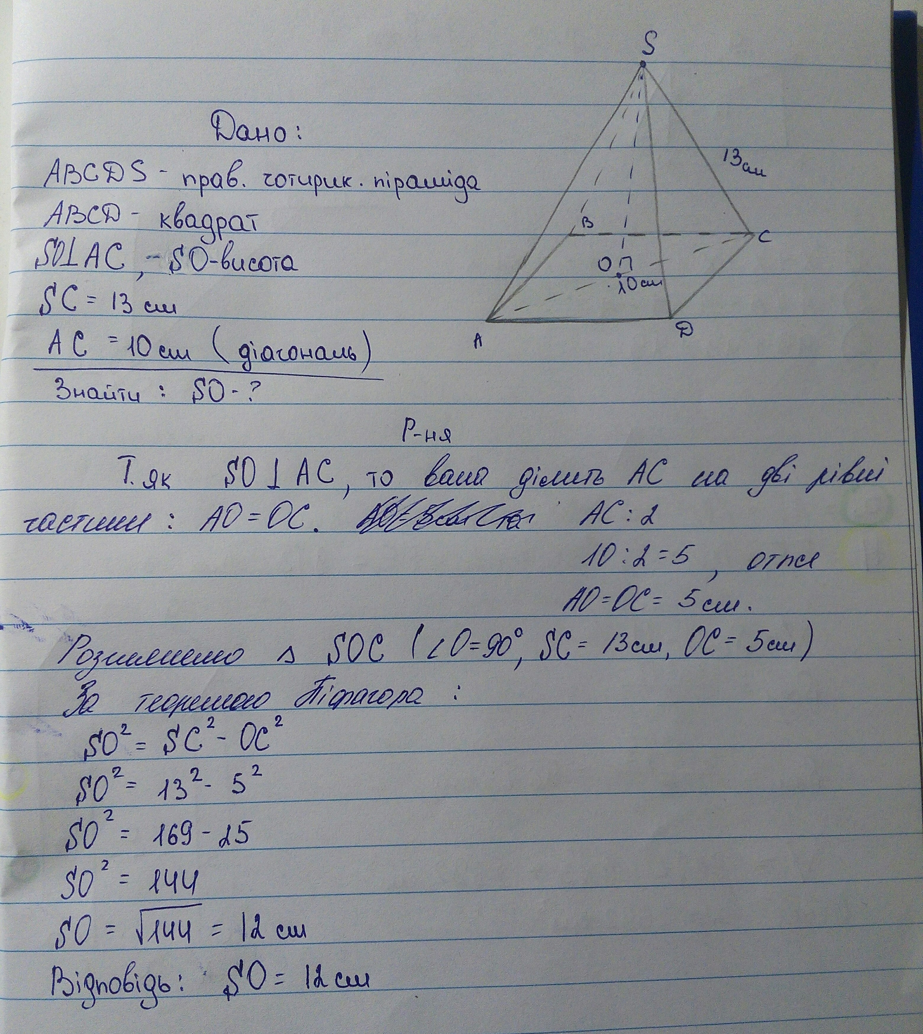 Знайдіть висоту правильної піраміди ,бічне ребро якої дорівнює 13см,а діагональ основи 10см,якщо ця піраміда чотирикутна(с рисунком)
