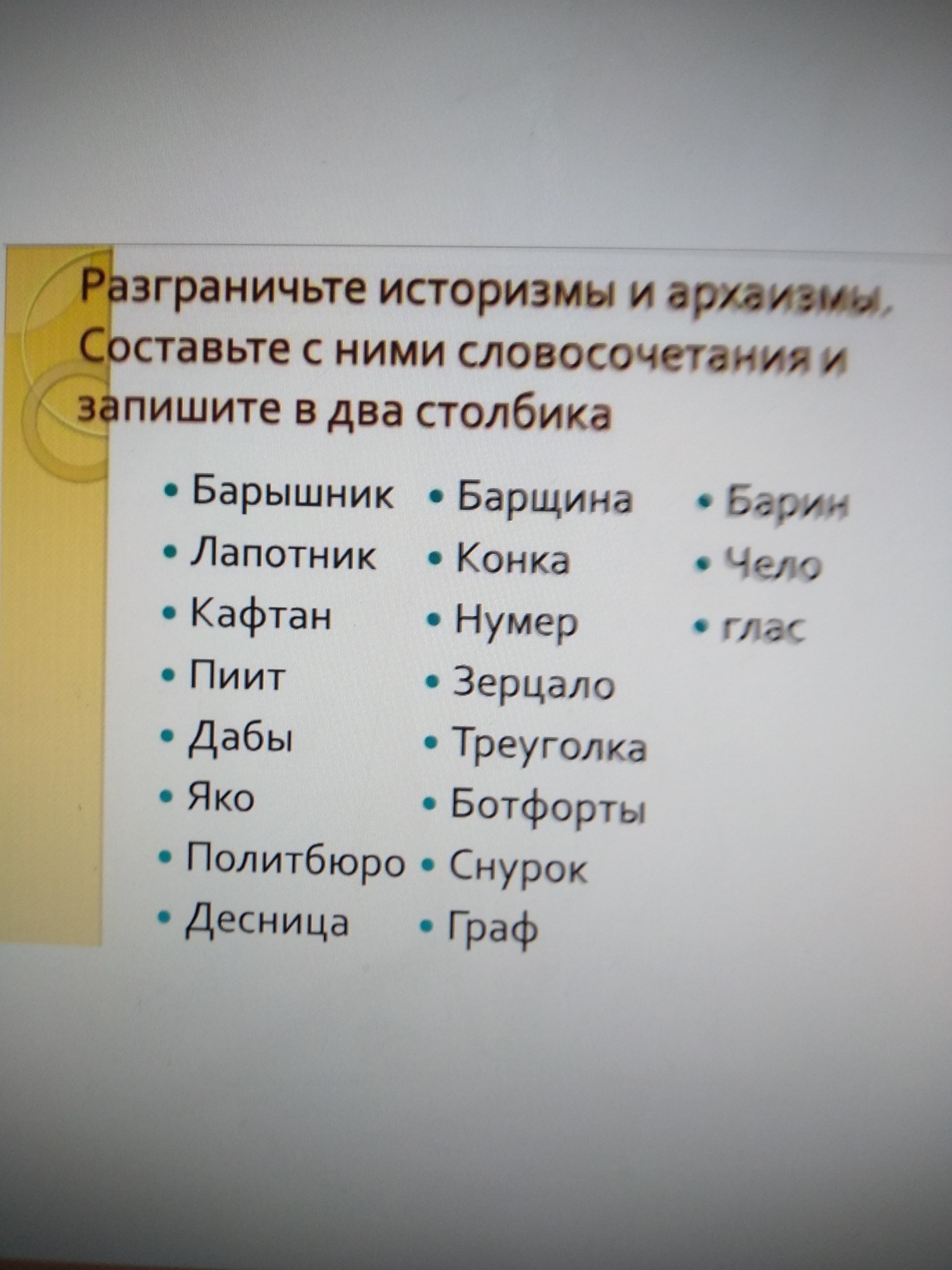 Архаизмы: барышник, пиит, дабы, яко, десница, нумер, зерцало, снурок, чело, глас