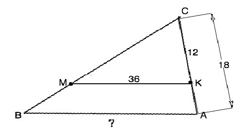 КМ║АВ. ⇒ ∠СМК=∠СВА и ∠СКМ=∠САВ - соответственные при пересечении параллельных КМ и АВ и секущей СВ, . ∆ СМК~Δ АВС по равенству углов. Из подобия следует отношение АС:КС=АВ:КМ. 18:12=АВ:36.⇒ АВ=18•36:12, ⇒ АВ=54 см
