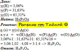 решить химическую задачу : химическое вещество содержит Гидроген,Фосфор и Оксиген.Массовые доли этих элементов соответственно 3,06%, 31,63% , 65,31%. Определите формулу вещества