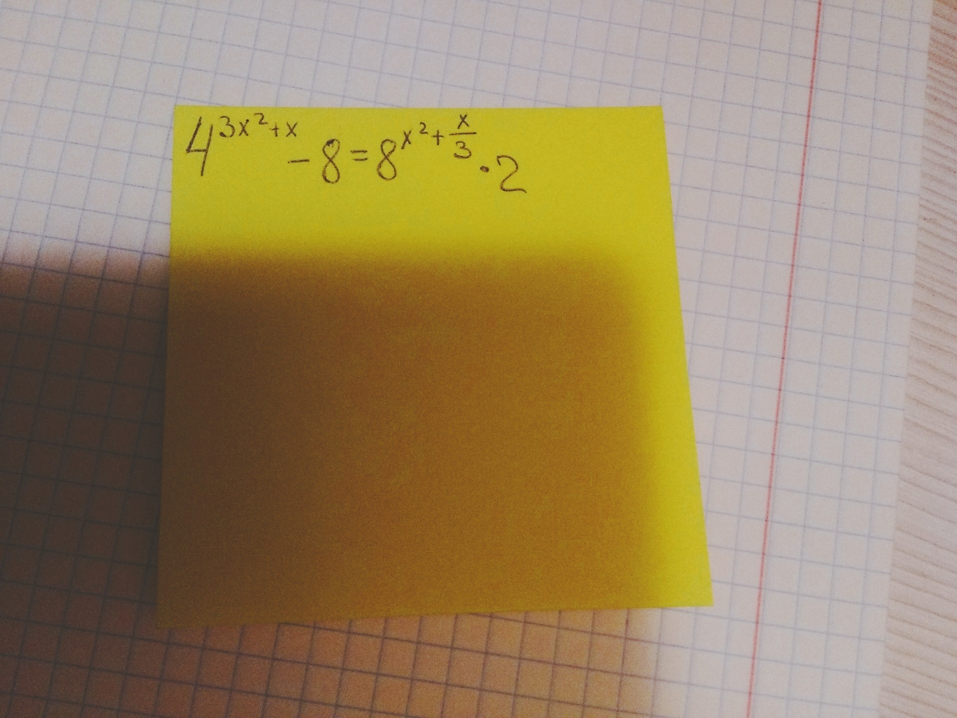 4^{3x^2+x} - 8 = 8^{x^2+x/3}*2\4^{3x^2+x} - 8 = 2^{3x^2+x}*2\2^{3x^2+x} = y\4^{3x^2+x} = (2^{3x^2+x})^2 = y^2\y^2 - 8 = 2y\y^2 - 2y - 8 = 0\y_{1} *y_{2} = -8\y_{1} + y_{2} = 2\y_{1} = 4\y_{2} = -2\2^{3x^2+x}=4\2^{3x^2+x}=2^2\3x^2+x=2\3x^2+x-2=0\x_{1}*x_{2}=-2/3\x_{1}+x_{2}=-1/3\x_{1}=2/3\x_{2}=-1