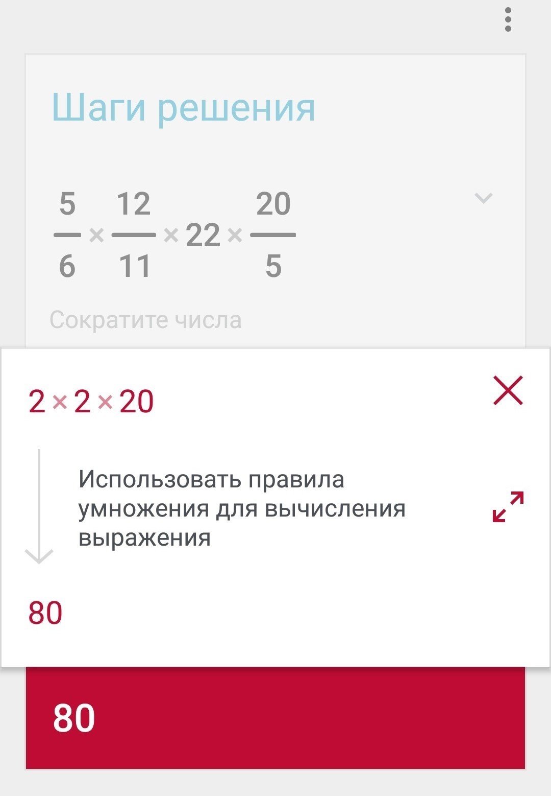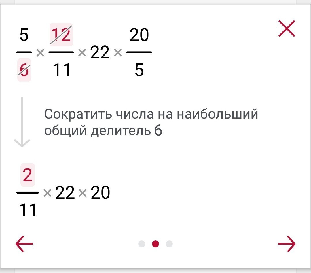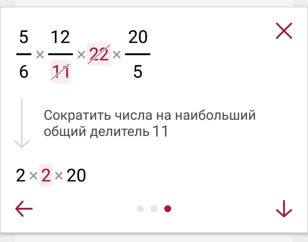 сколько будет пять шестых умножить на двенадцать одинацетых и умножить на двадцать две двадцать пятих?помогите пожалуйста.